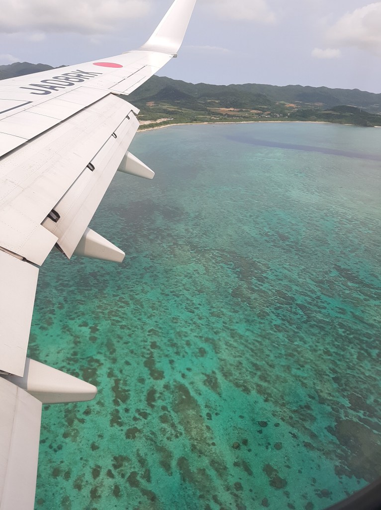 石垣空港へ近づき、高度がどんどん下がってくると、珊瑚礁のきれいな海が見えてきます。