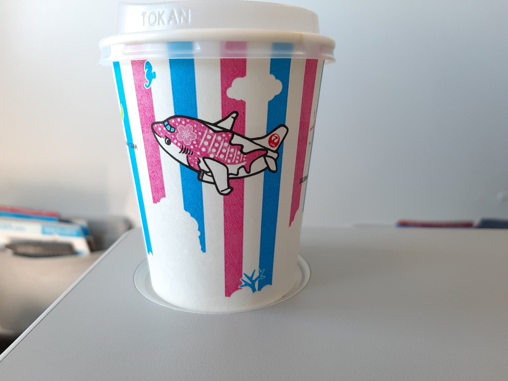 機内ドリンクサービスのカップもジンベエ仕様。