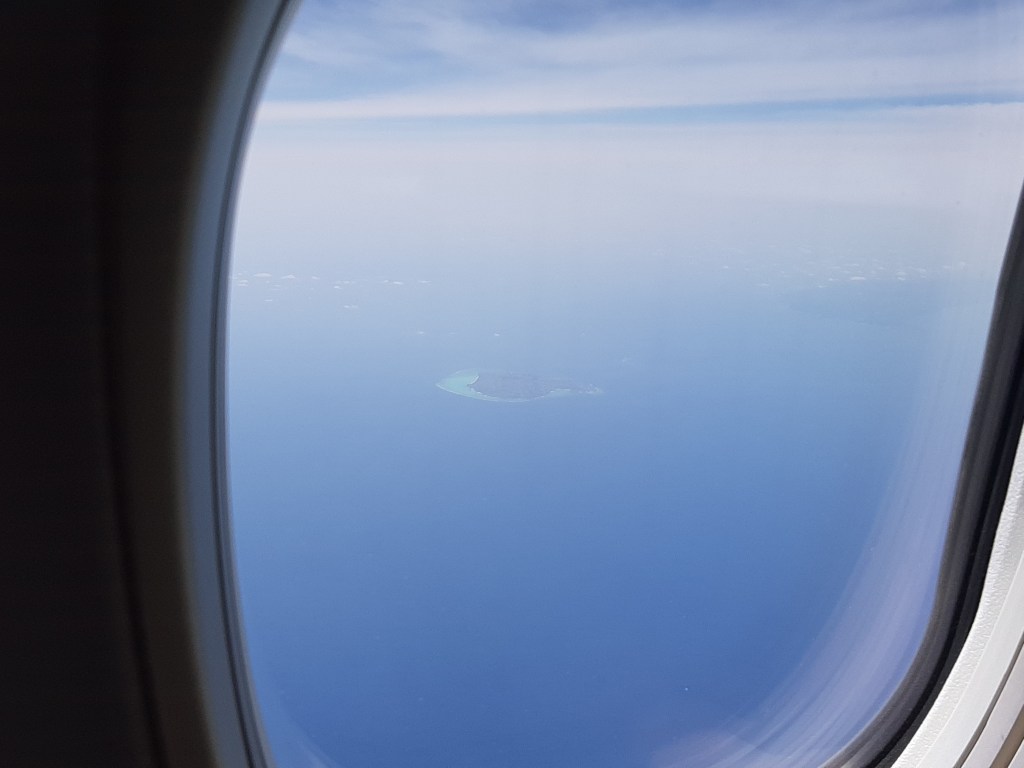 窓の外を見ると、その周辺だけエメラルドグリーン色に輝いている小さな島が見えます。