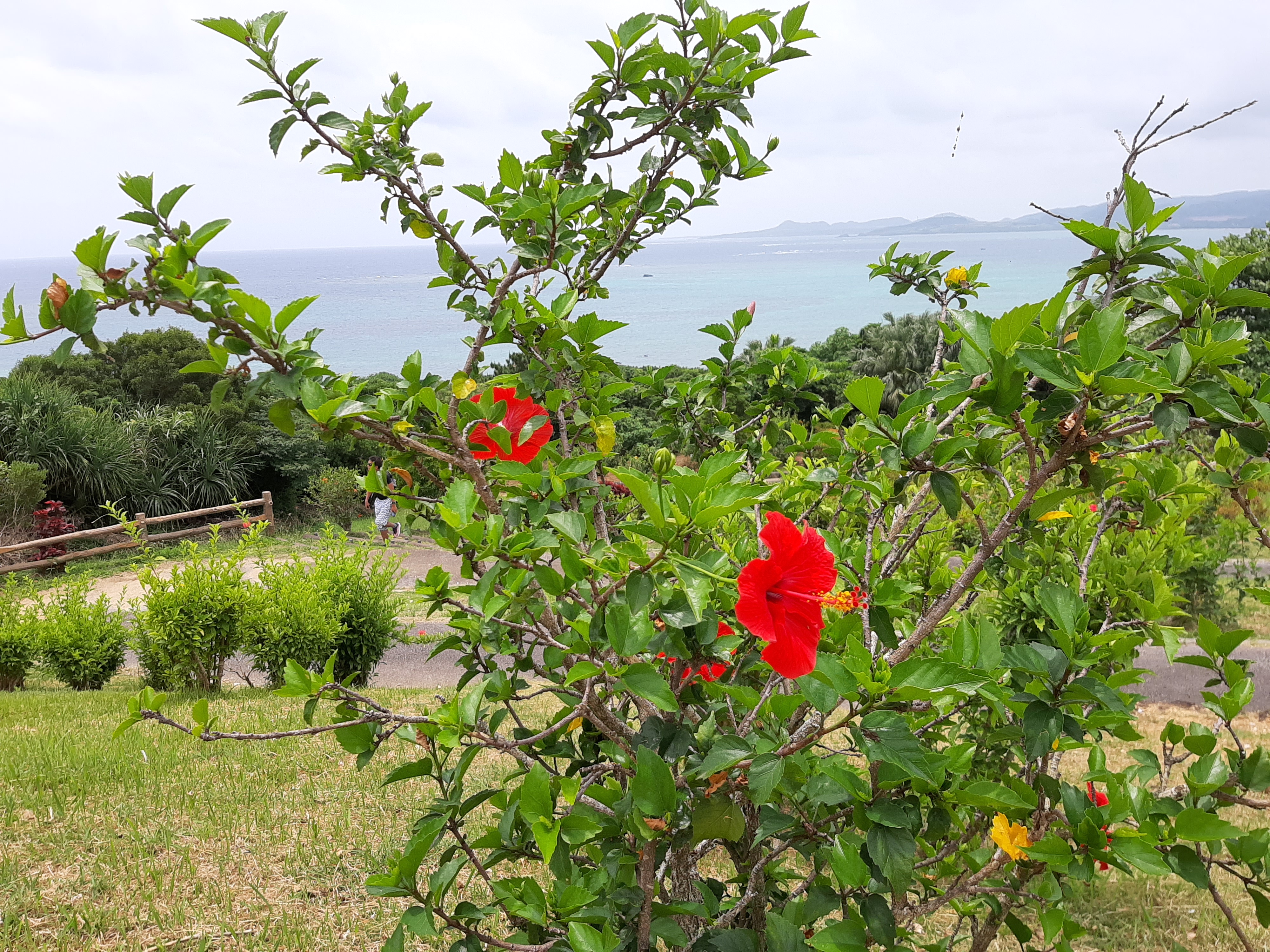 なかなかの絶景です。雲っていたので写真ではあまり映えませんが、白い砂浜とコーラルブルーの海、赤いハイビスカスの花、これに紺碧の空と白い雲があれば完璧なんですが…
