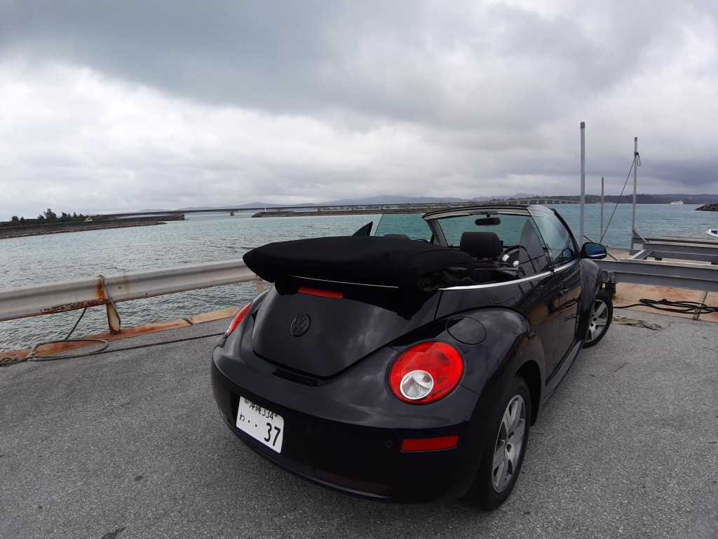 食後は車を出してもらい、古宇利大橋を目指します。お天気も良くなってきたので、オープンカーにします。