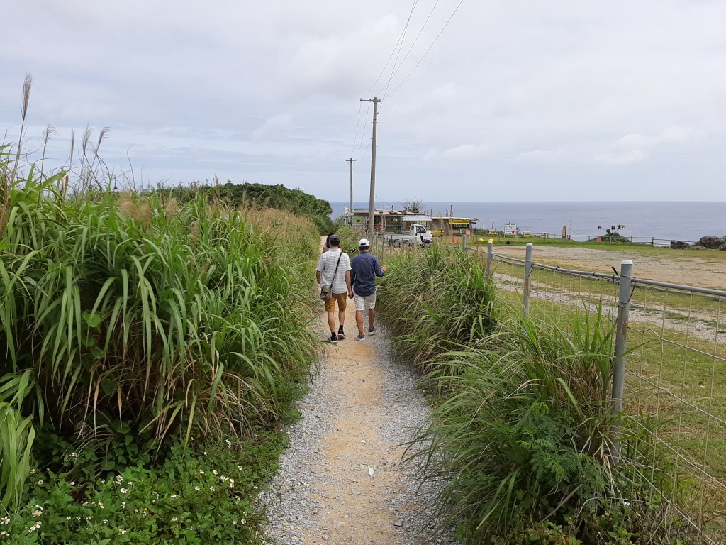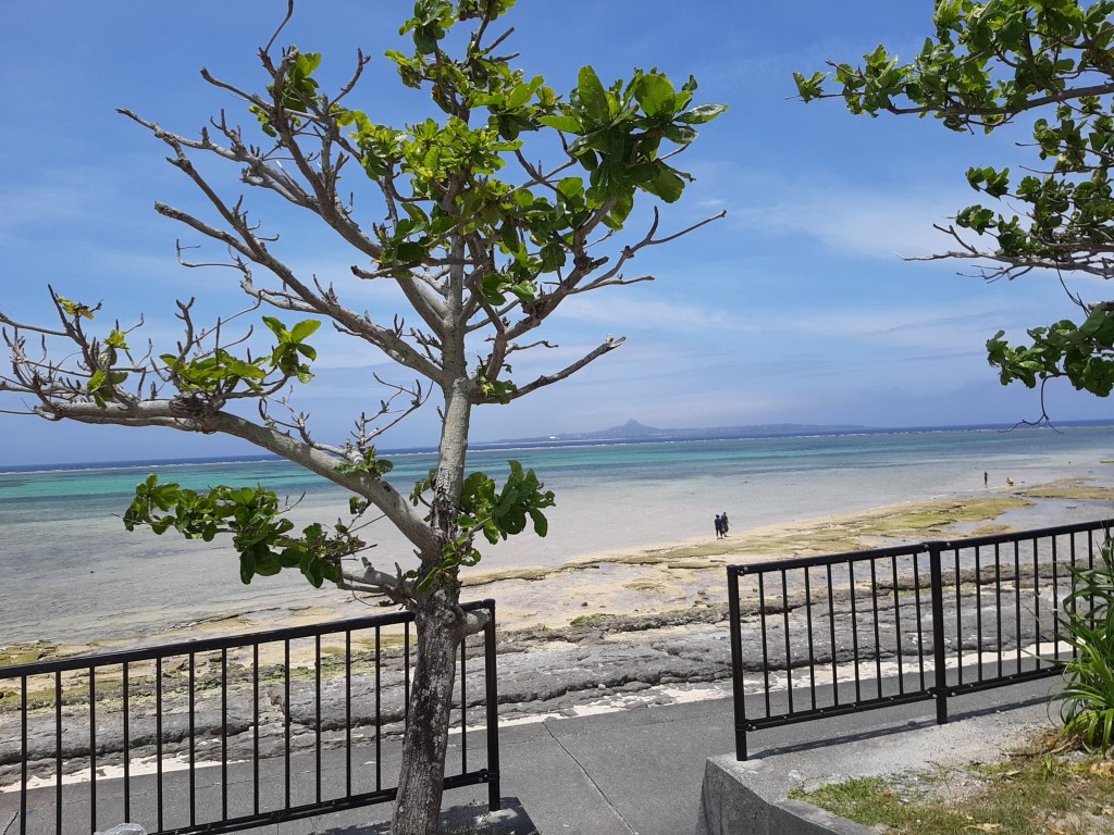 フクギ並木通りを順路の通りに歩くと海に出ました。対岸に伊江島が見え、ミニミニ富士山のようなものが見えます。