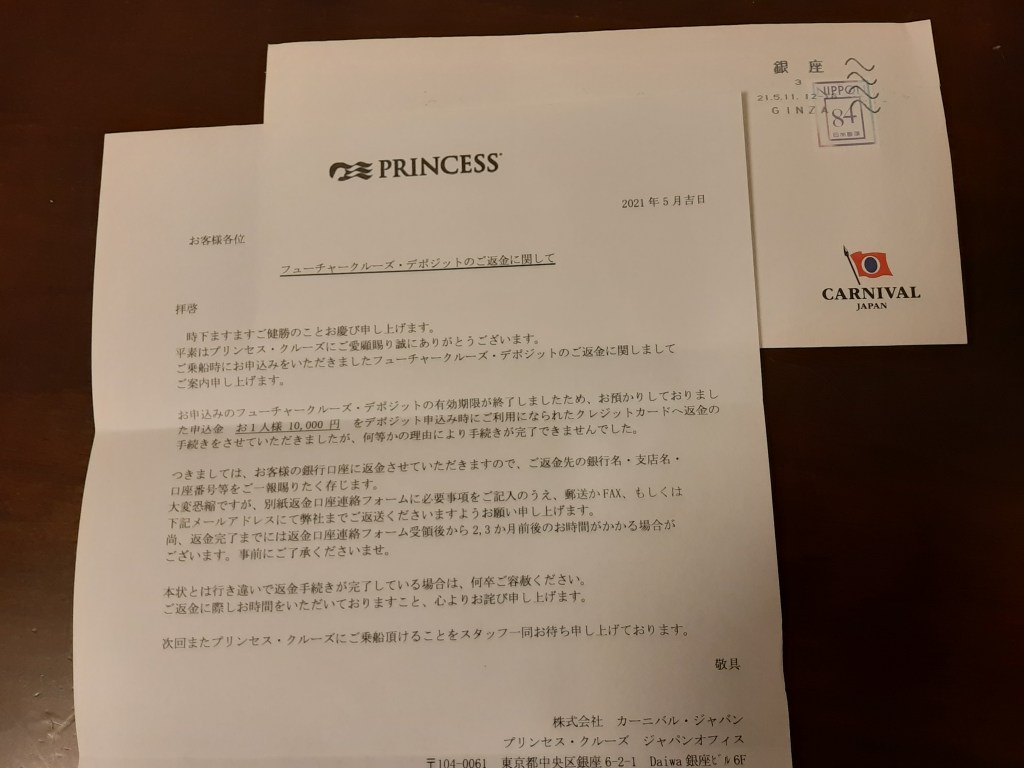 何だろう?と思いつつ開封してみると、「フューチャークルーズ・デポジットの返金に関して」というお知らせでした。