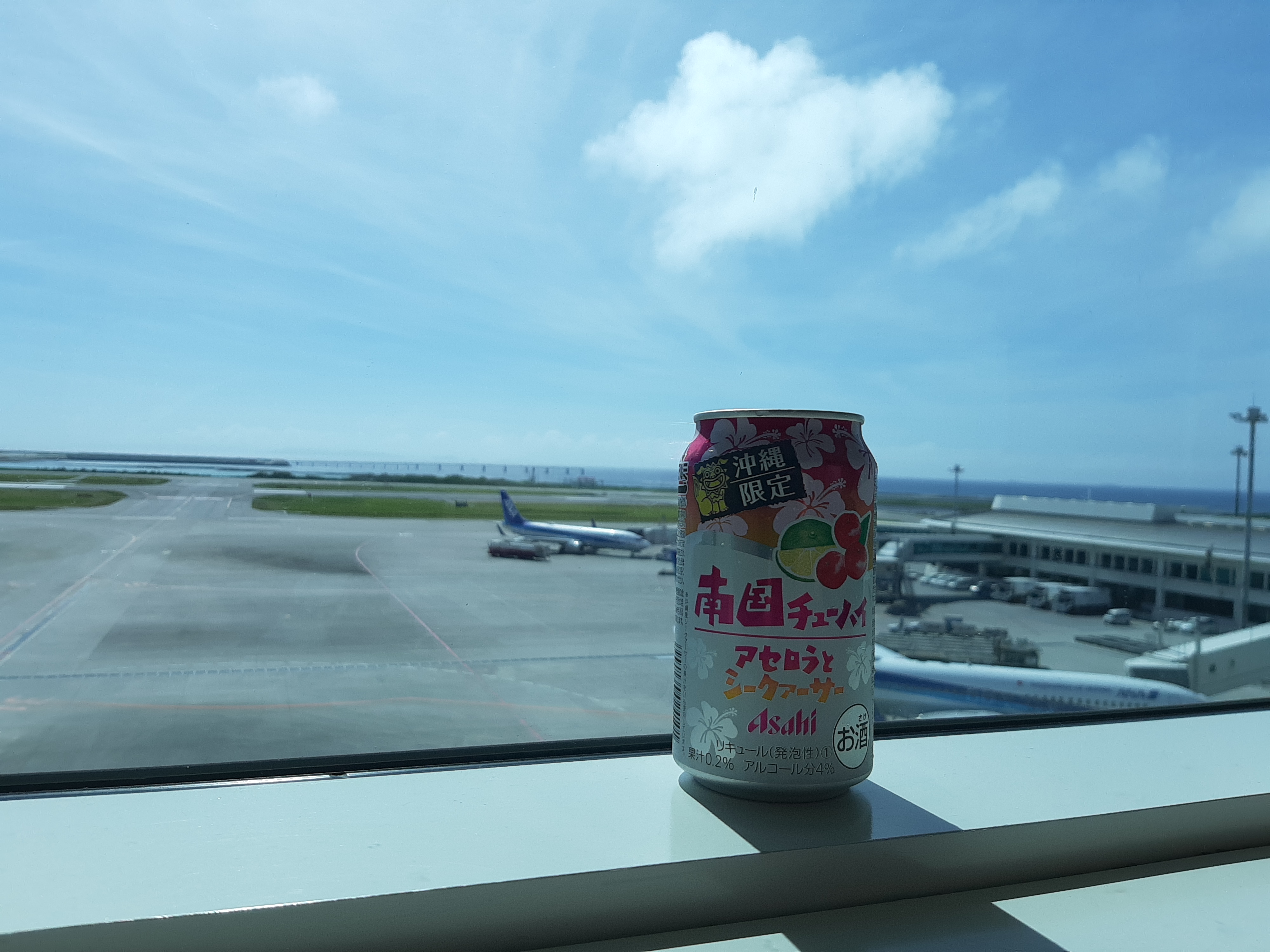 那覇空港に着いて喉がかわいていたので、ファミマで沖縄限定の南国チューハイを買い、空港を見ながらグビグビ。
