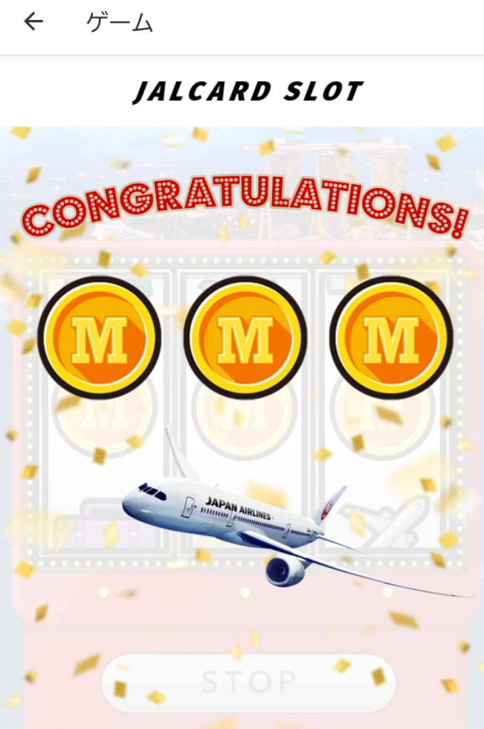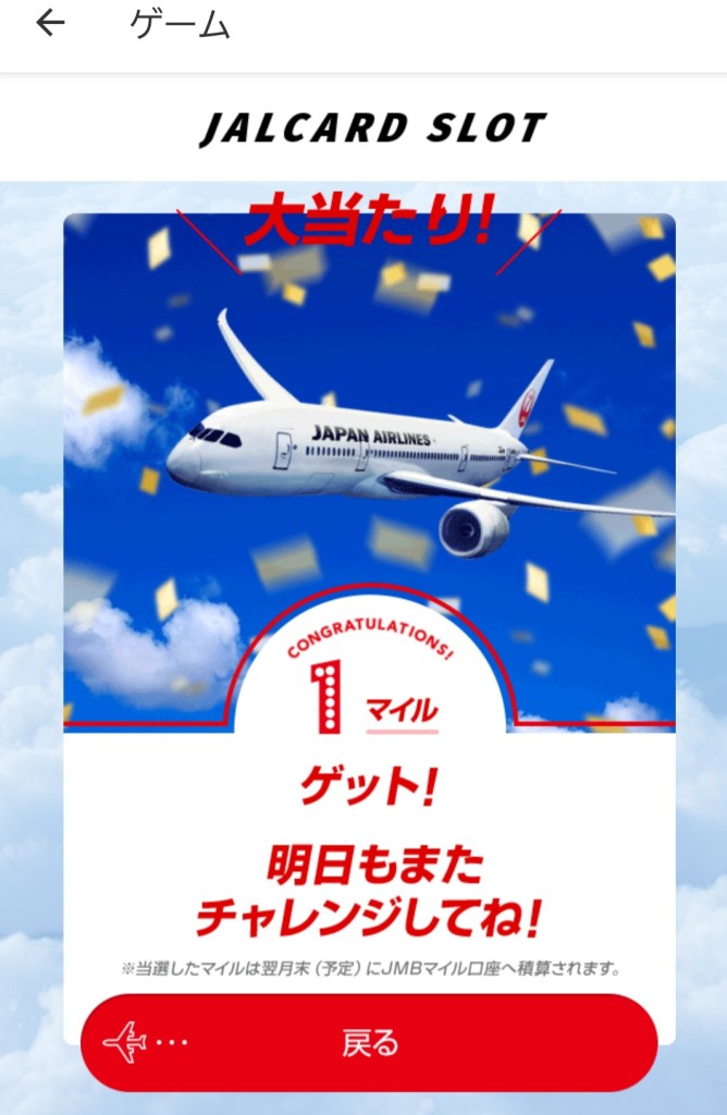 さらに、今朝はJALカードのゲームに挑戦したら、久しぶりに1マイル当たりました。