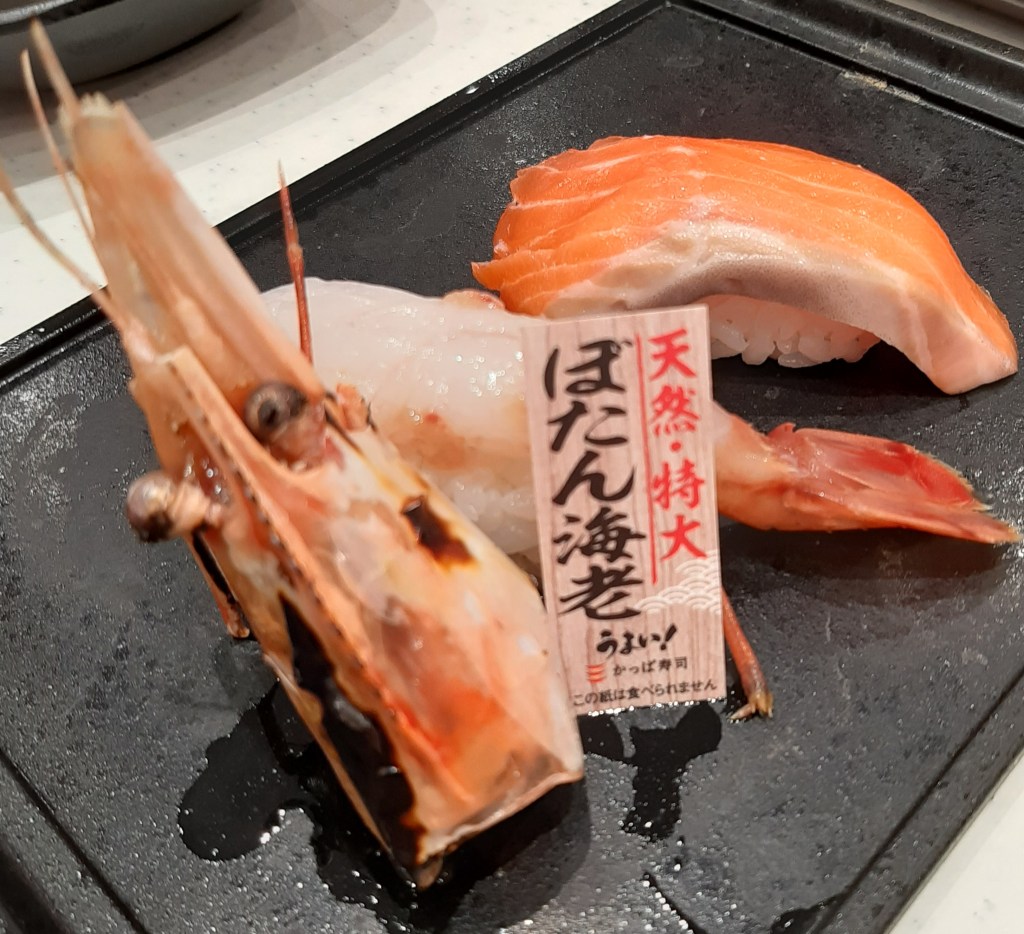 「天然 特大ぼたん海老」(330円) を注文したら、尾頭と札まで付いてきました。