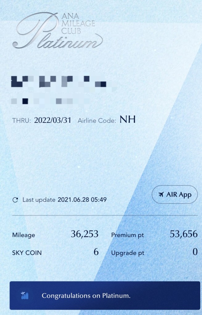 ANAマイレージクラブのアプリのステイタスが、ようやくPlutinumになりました。