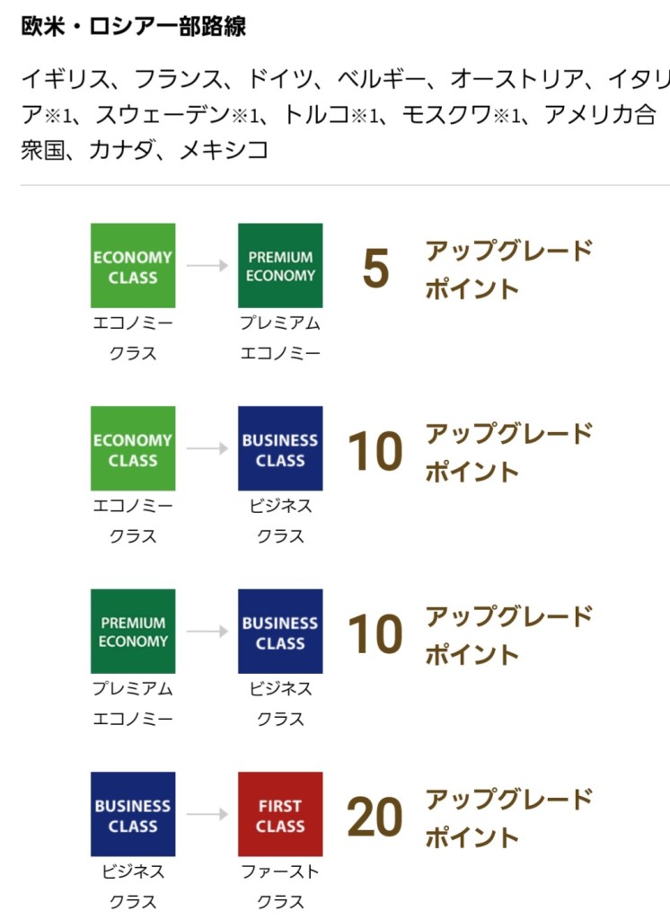 国際線の場合は、行く方面やアップグレード先のシートにもよりますが、例えば欧米行き路線だと5~20ポイント必要です。