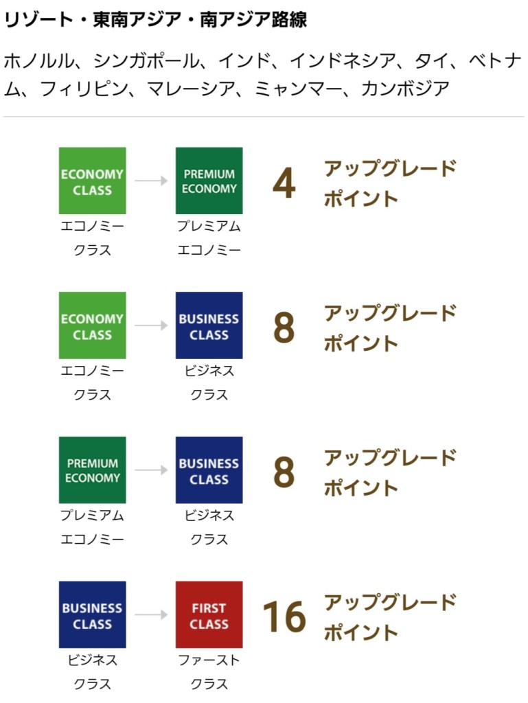 ハワイや東南アジア行き路線だと4~16ポイントでアップグレードが可能です。