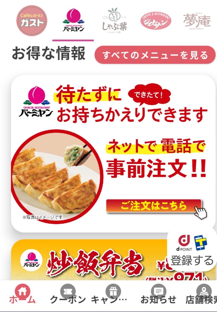 トラさんは、スマホに入っているすかいらーくのアプリからバーミヤンのクーポンを探します。クーポンだと商品が割引になるものもあります。