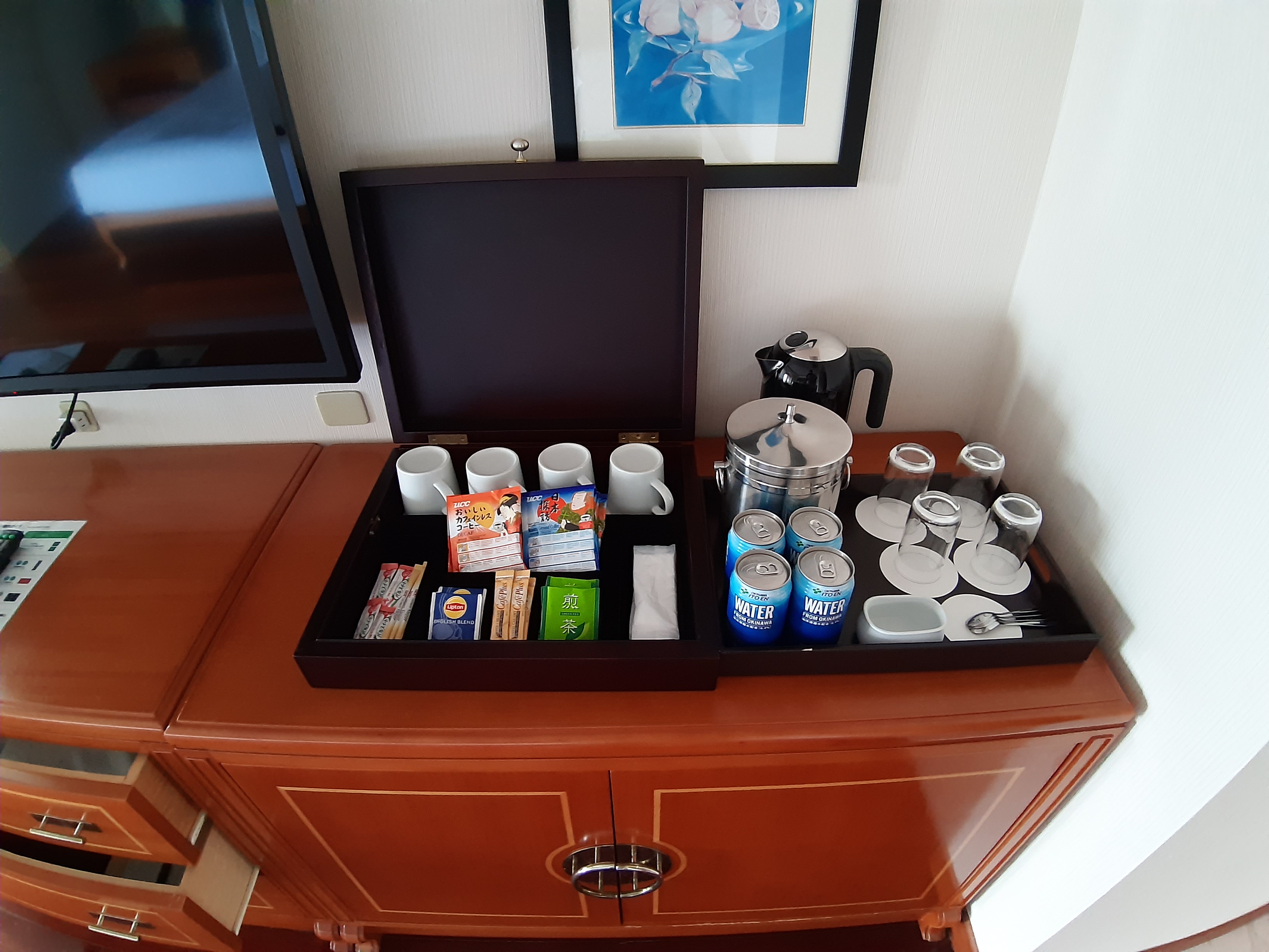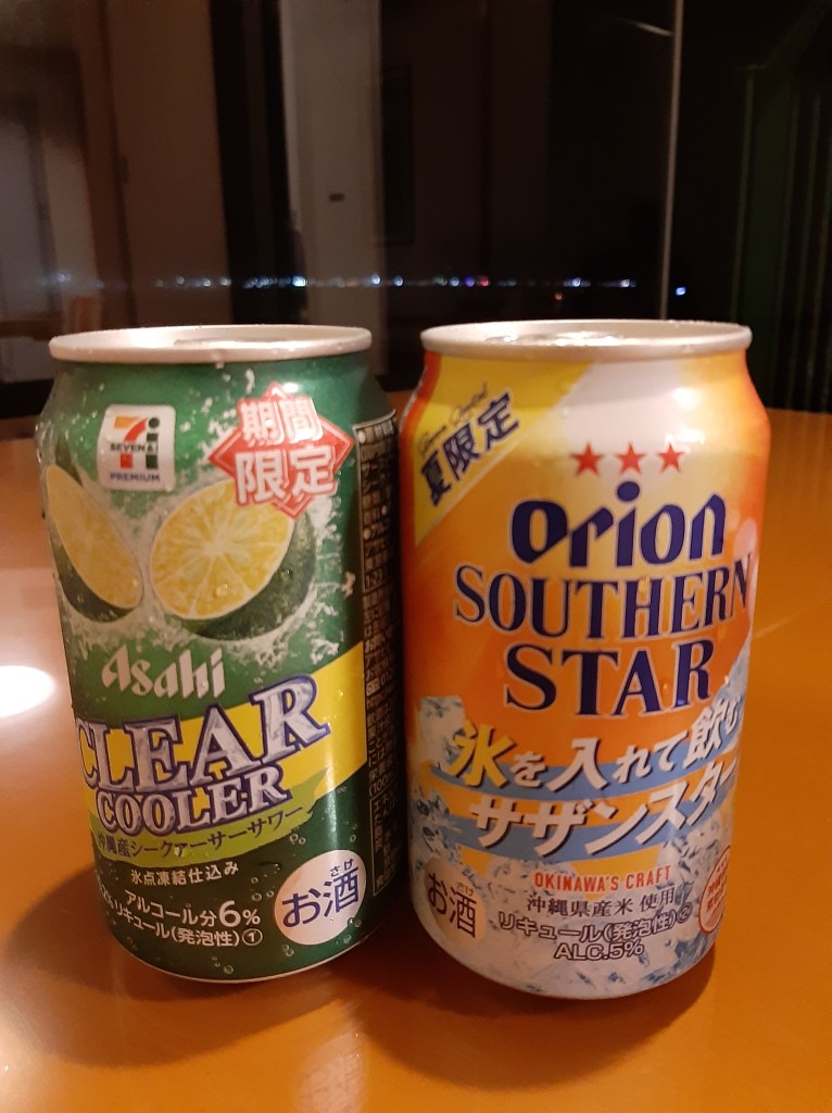 オリオンのリキュールとシークァーサーサワーも一緒に購入して部屋の掘りこたつスペースで名護市の夜景を楽しみながら頂きます。カウちゃんは蒸し鶏とシャキシャキ野菜サラダと部屋にあるリプトン紅茶。