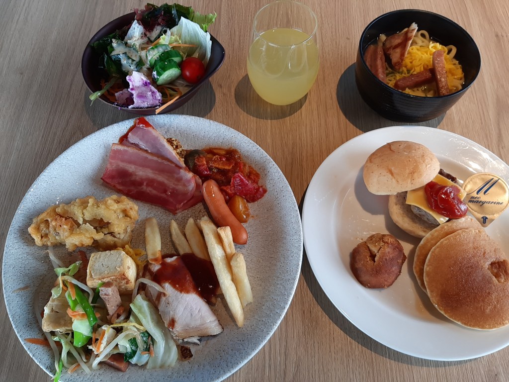 朝食は朝7時から10時半までロビー階(2階)の「ブッフェ&グリル クワッチー」で頂けます。トラさん達も7時に行きました。最初は広いレストランの一部の席しか埋まっていませんでしたが、トラさん達が帰る8時頃にはほぼ席が埋まっていました。やはり早く行く方がいいですね。
