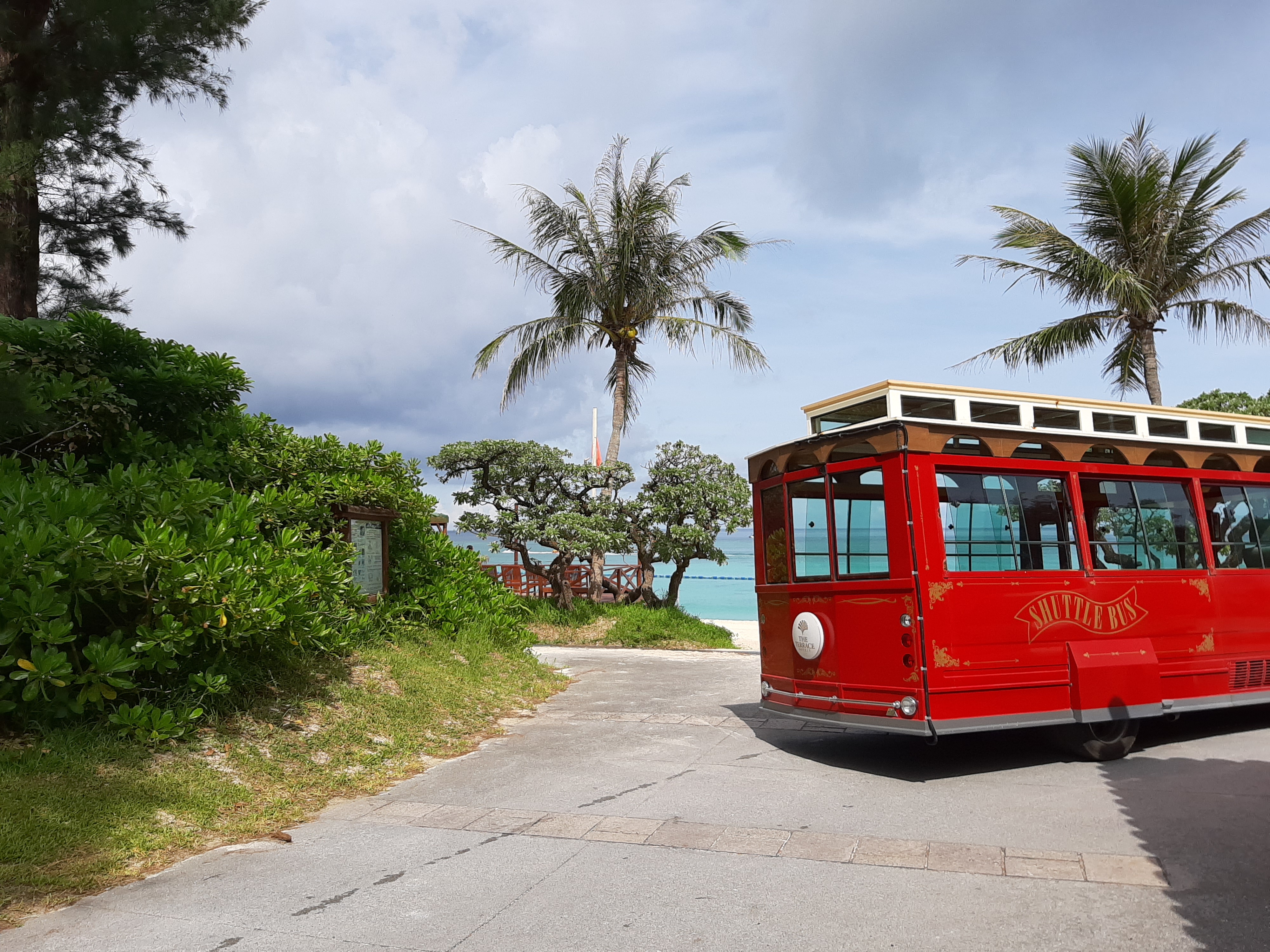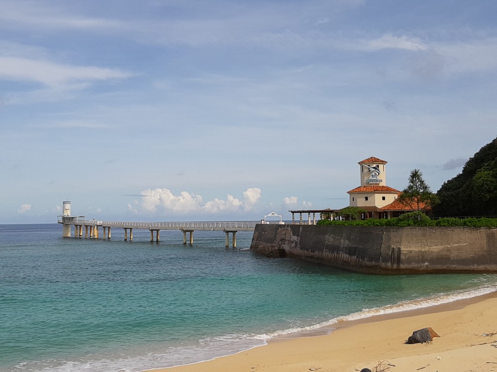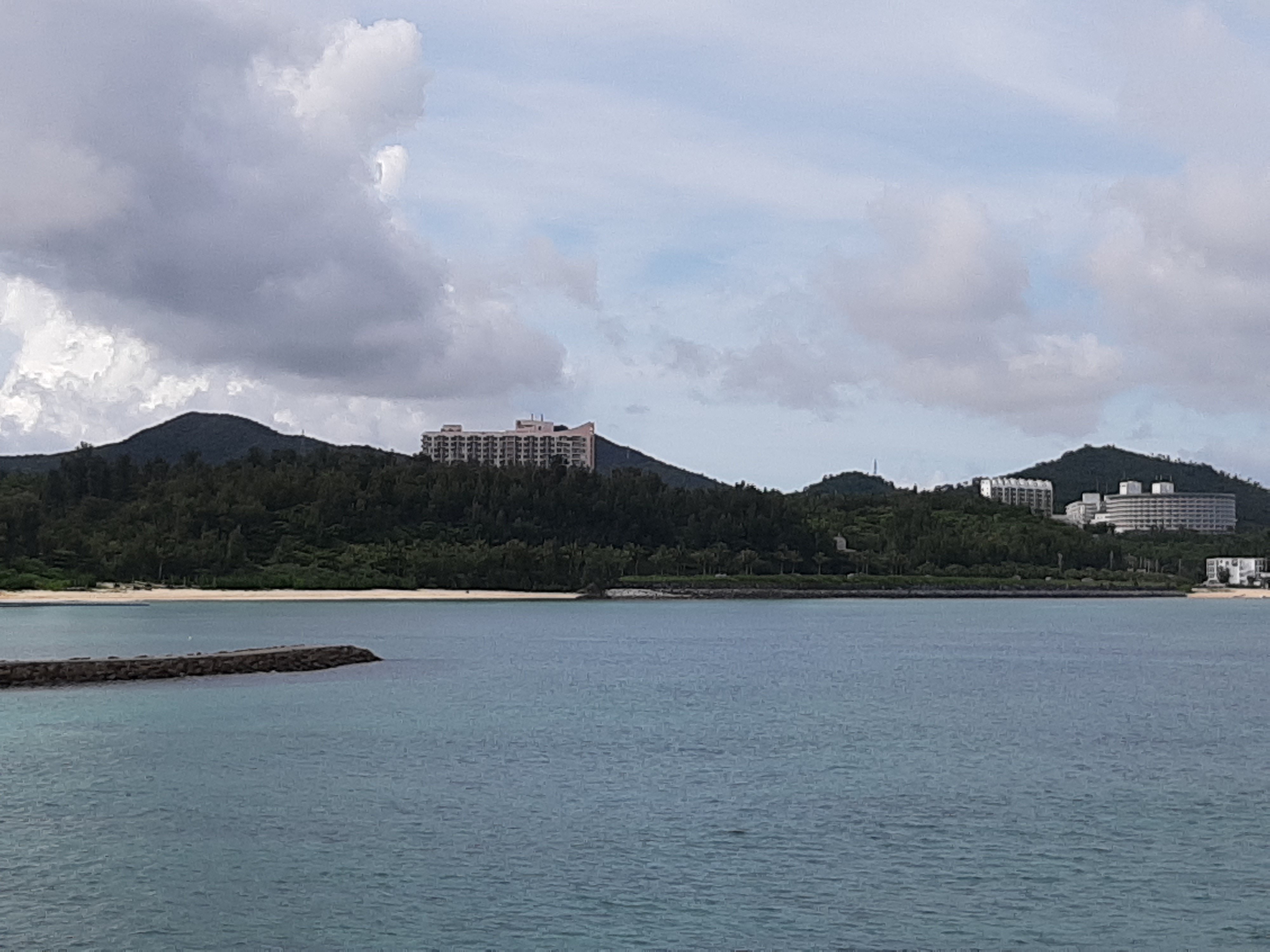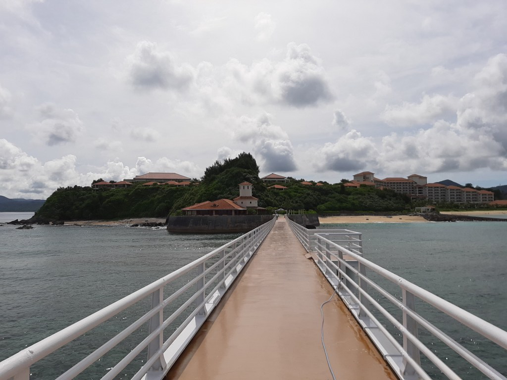 海中展望塔へは歩くと15分、シャトルバスもあるとのことですが発車時刻までの待ち時間が長かったのでぶらぶら歩くことにしました。ブセナ・テラスのプールもちらりと見えます。後から知りましたが、2000年7月に開催された九州・沖縄サミットの会場になったホテルだそうです。