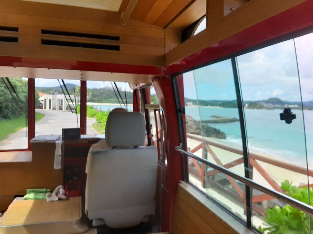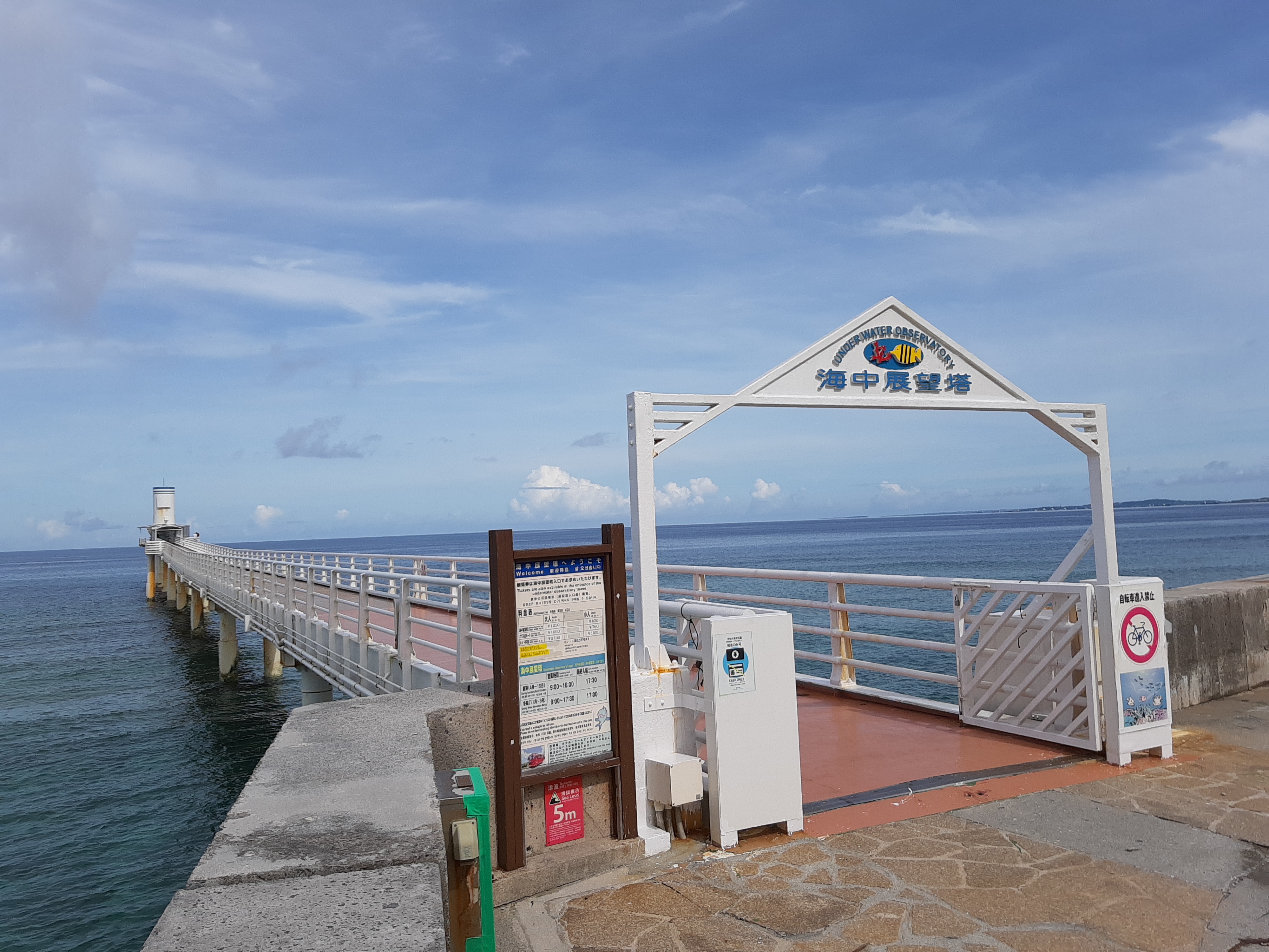 車を停めてから歩いてすぐの所にビーチハウスがあり、海中公園への入場券売場もあります。海中展望塔への入場券は1,050円、グラス底ボートは1,560円、両方セットだと2,100円です。イオンマークのついたカードを見せると受付の方が自動券売機にバーコードを読ませ、割引料金が表示されます。トラさん達は海中展望塔のみ行くので、10%割引のひとり940円になりました。