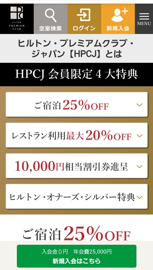 ANAのブロンズ以上の上級会員になると、HPCJ (ヒルトン・プレミアムクラブ・ジャパン) の年会費割引特典があります。勧誘メールや封書が届くわけではなく、ANAのHPに出ているので、そこから申し込む必要があります。