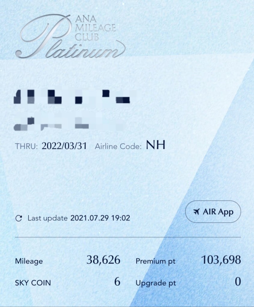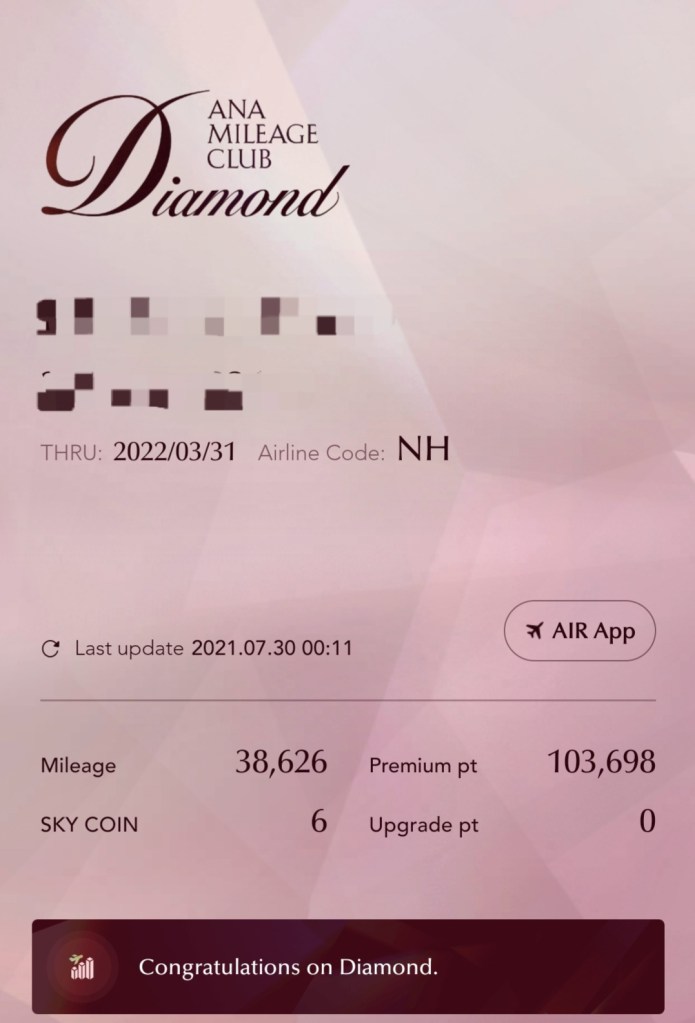 ANA 10万超PP達成❗ 7月 30, 20217月 30, 2021 ~ traveltiger88 2021年7月29日(木) 今日の夕方、ANAマイレージクラブのアプリを見てみると、プレミアムポイントが10万PPを越えていました。6月に修行した分のPP2倍キャンペーンが適用されました。明日にはアプリもDIAMOND Ver.に変わるでしょうか。楽しみです。 103,698 PPで10万超達成! 日付が変わってANAマイレージクラブのアプリ画面を確認すると… DIAMONDに変わっていました。 Diamondステイタスの画面 共有: クリックして X で共有 (新しいウィンドウで開きます) X Facebook で共有するにはクリックしてください (新しいウィンドウで開きます) Facebook いいね 読み込み中… 関連 投稿者: traveltiger88 traveltiger88 の投稿をすべて表示