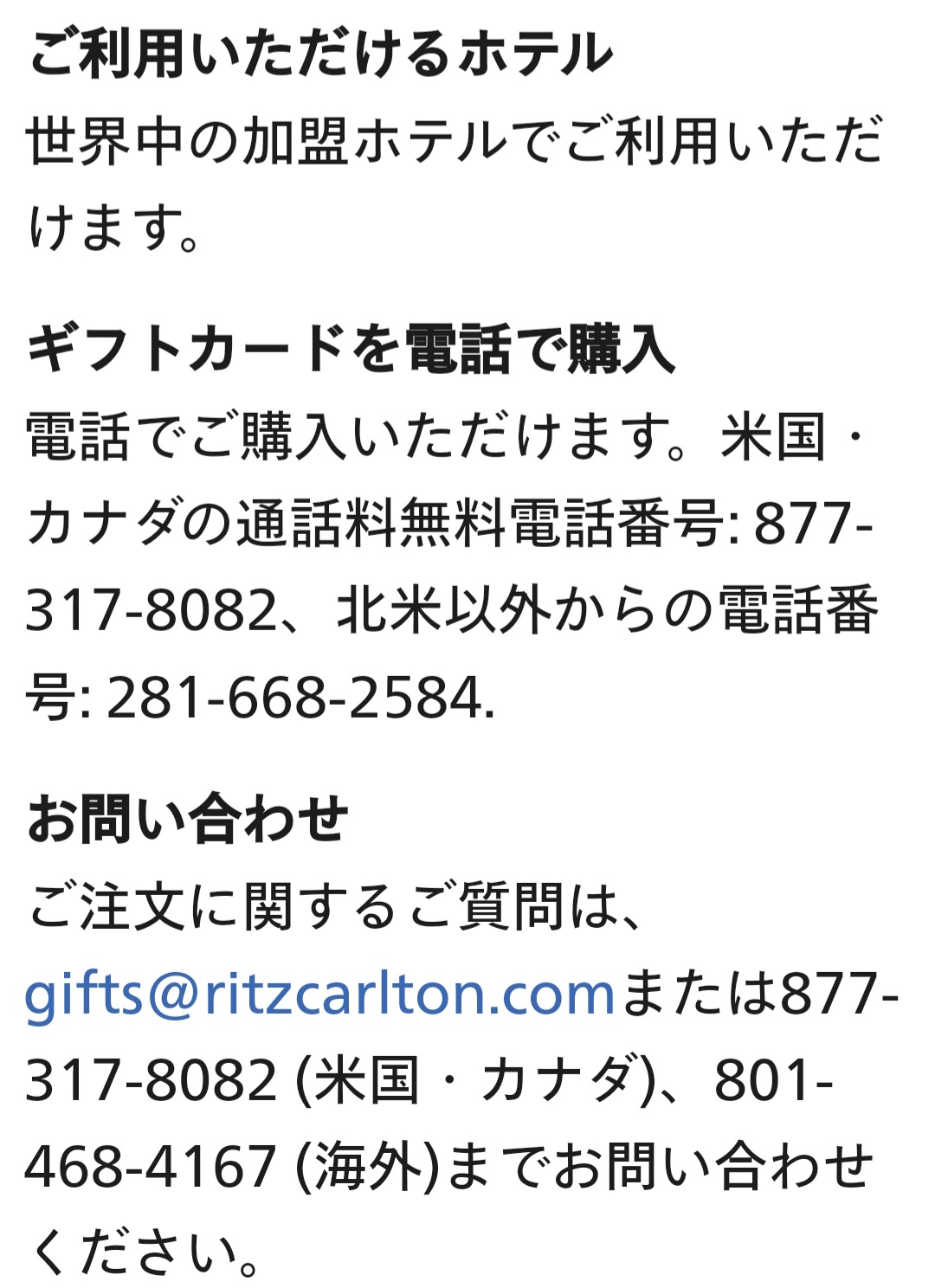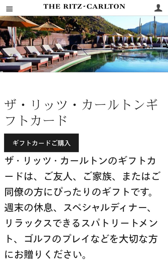 リッツカールトンのギフトカードはHPにも載っており、購入ボタンもあるのですが、先へ進めません。無料電話番号もありますが、国際電話になりそうです。