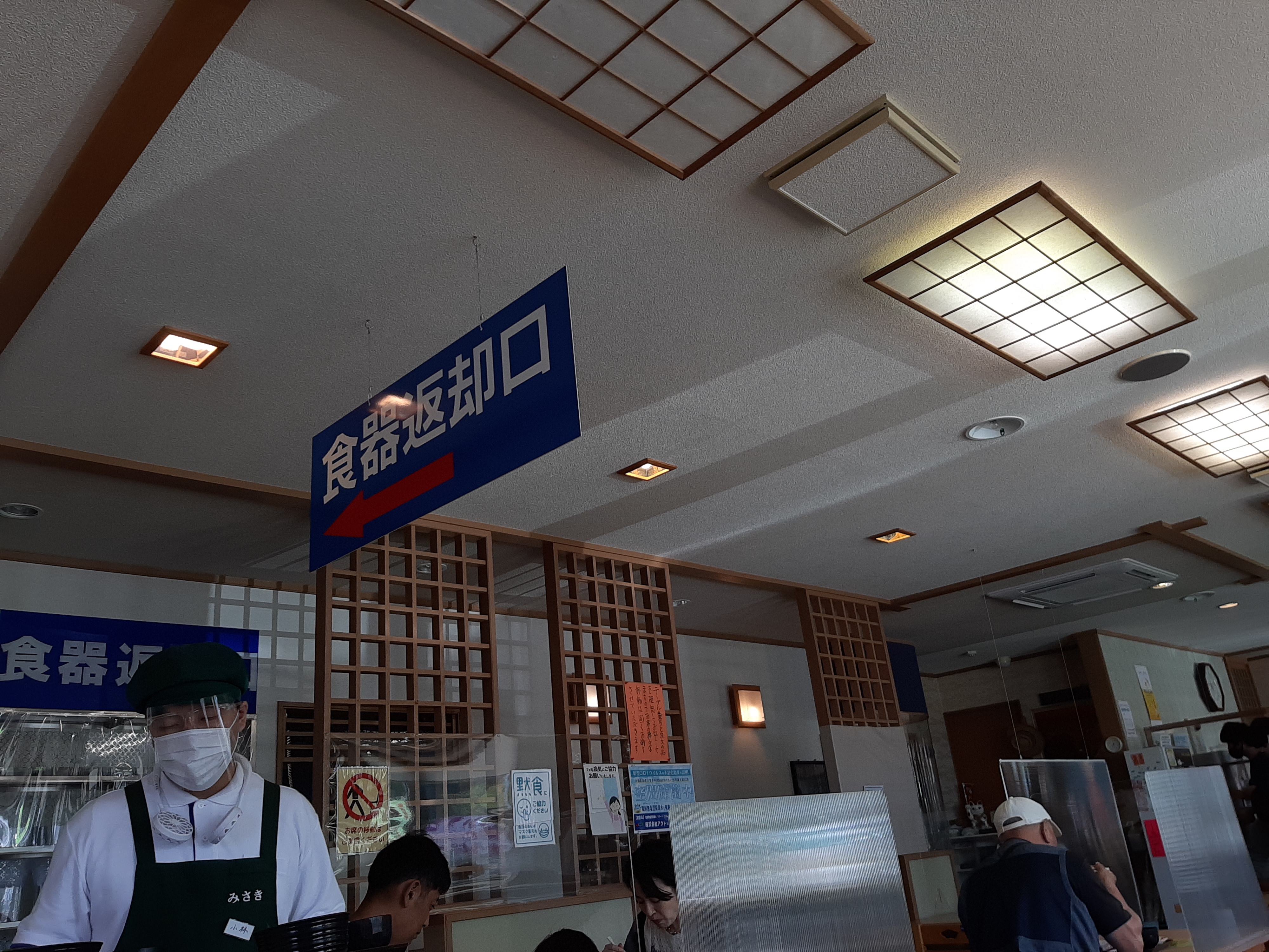 並び始めて12~13分くらいでお店の中に入れました。券売機で食券を購入するスタイルです。トラさんは海鮮丼(2,980円)を、カウちゃんは三色丼(2,980円)の食券を購入しました。食券を受付に渡すと席の番号を指定され、そこで待ちます。お茶やお水はセルフサービスです。食器も自分で返却口へ運ぶ方式です。