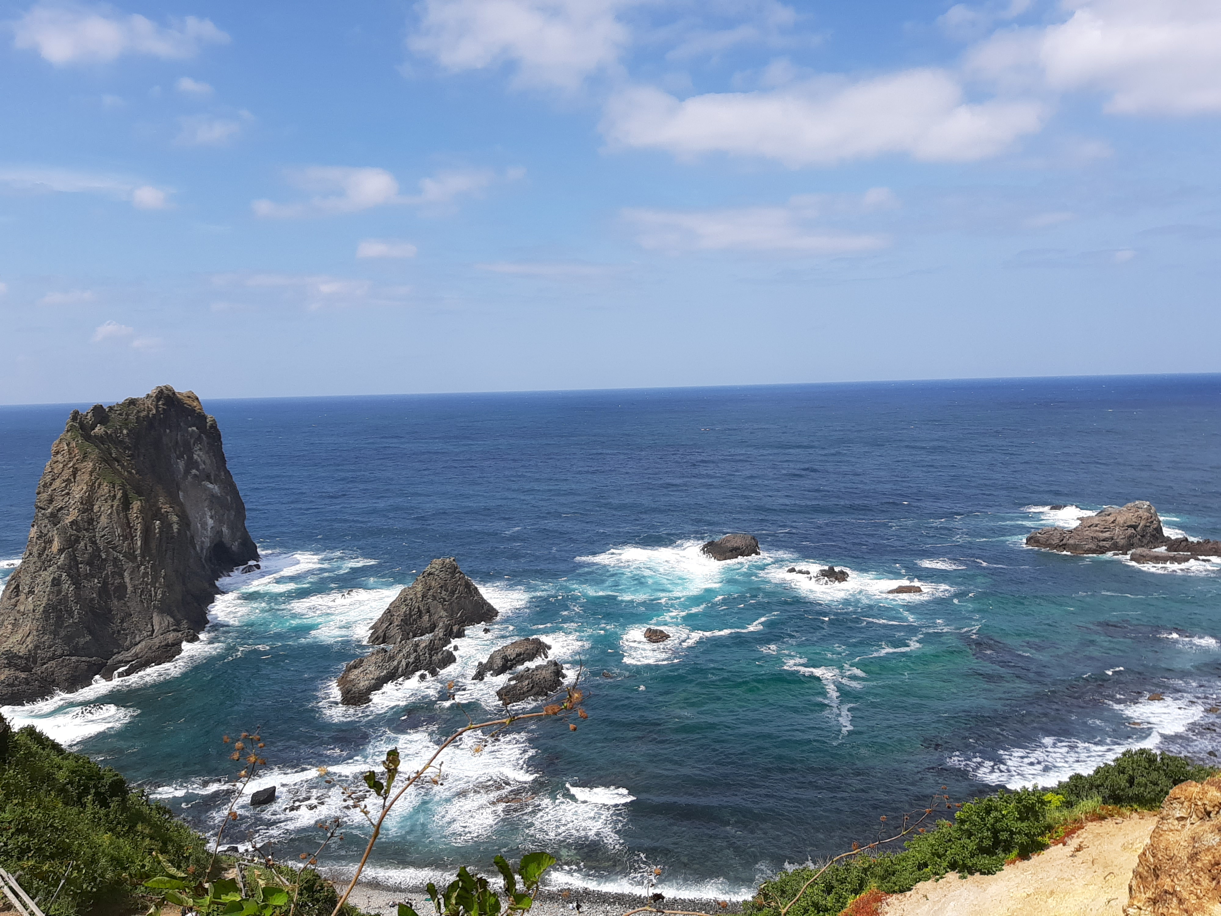 岬の先端に向かって右側は強風が吹いており波も立っていますが、左側は風もあまりなく、実に穏やかな海という対照的な光景が広がっています。