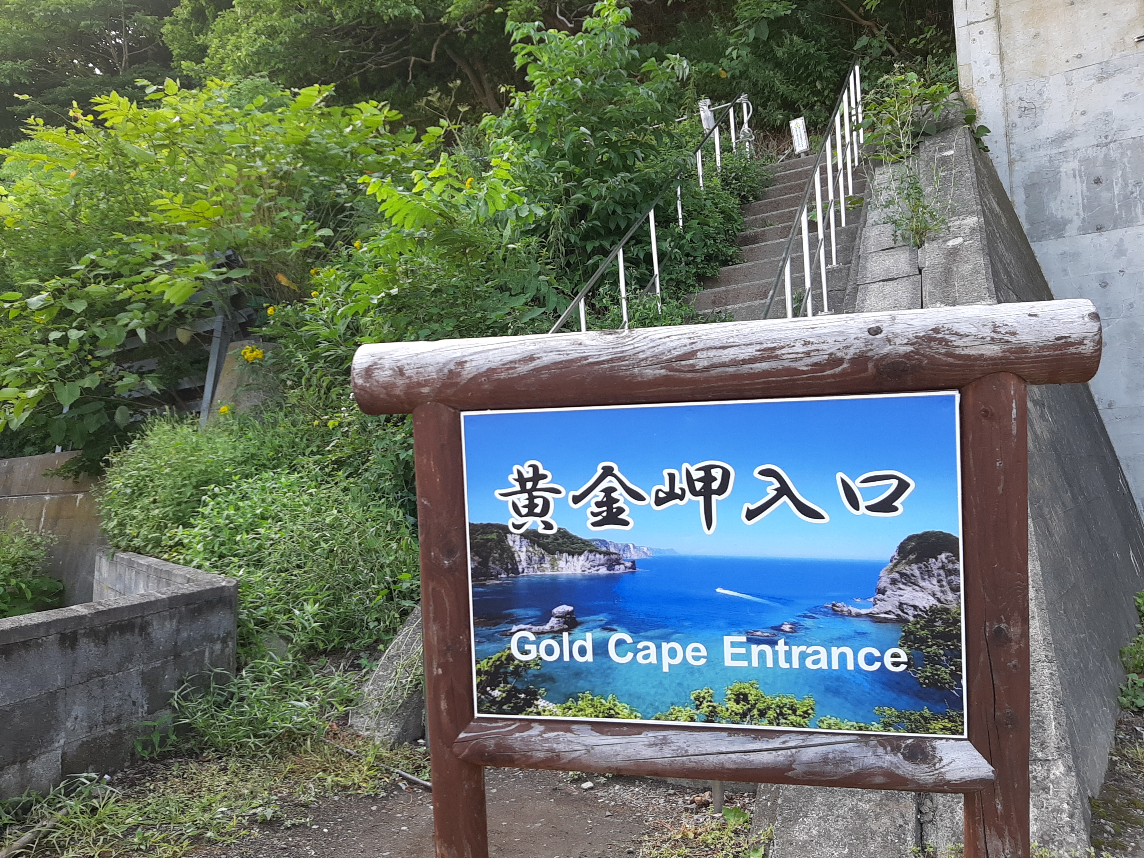 神威岬の次は黄金岬を目指します。積丹町観光センターの駐車場に車を停め、階段まで5分くらい歩きます。階段が急なため、翌日以降の筋肉痛の原因の一つと思われます。
