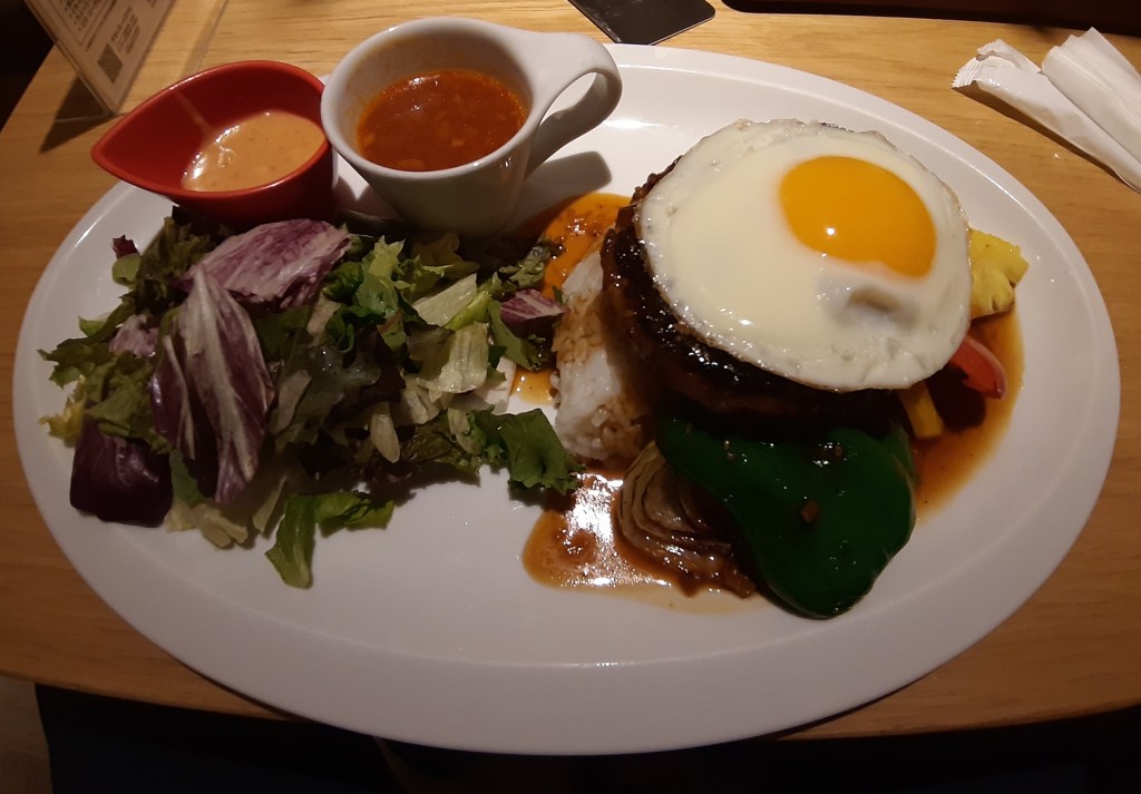 名前からも連想できる通りのお洒落な雰囲気のお店です。メニューも女性が好みそうなものが並んでいます。トラさんは「ロコモコプレートTERIYAKIソース(スープ付)」(1,188円)を、カウちゃんは「20品目のGOODバランスサラダ」(858円)を、デザートにアプリクーポンで43円引きになる「エスプレッソアッフォガード」(440円)を注文しました。
