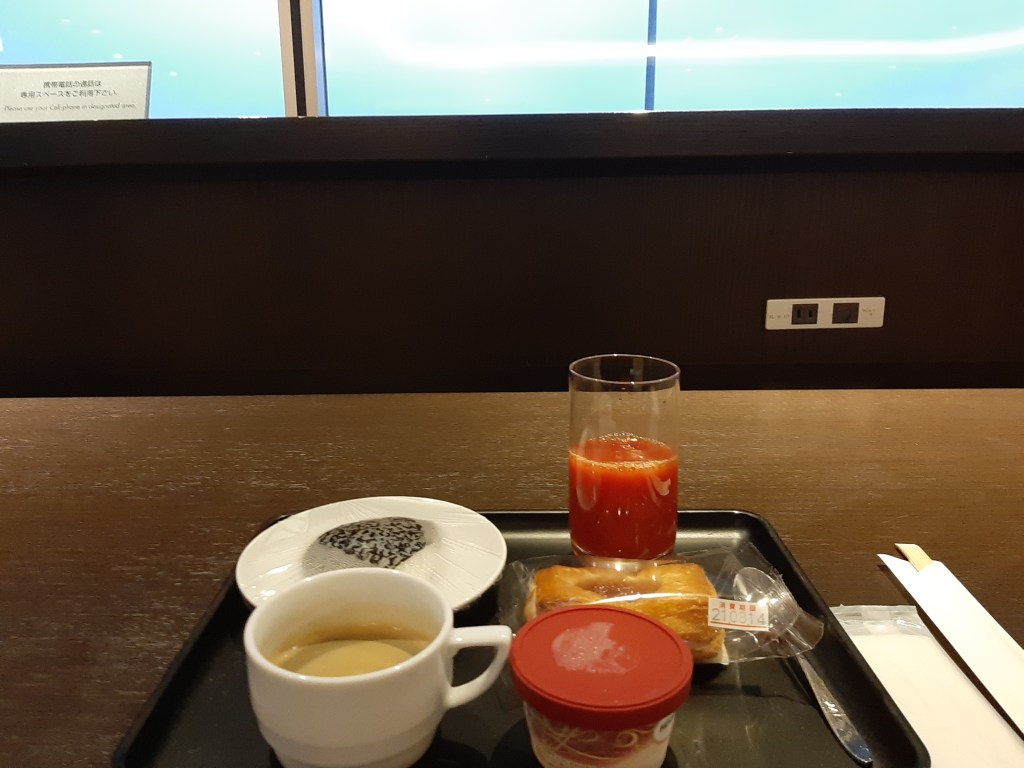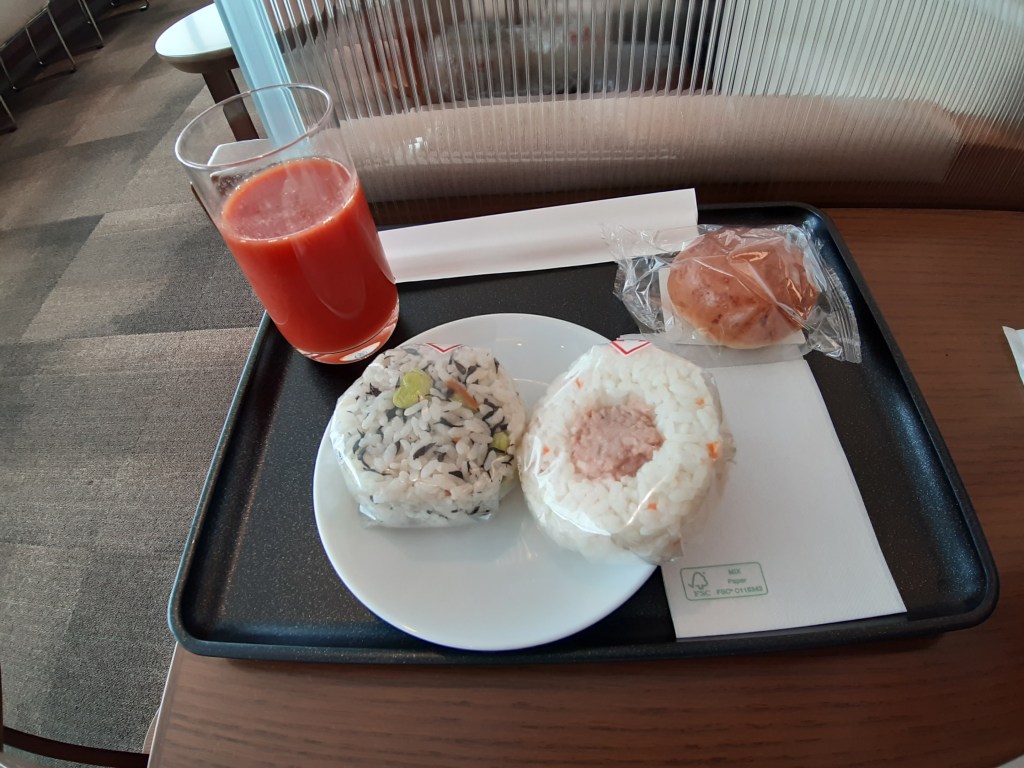 ファーストクラス用ラウンジに行くと、ちらほら人がいる程度です。飲み物だけではなく、おにぎりやパンなどの軽食もありました。お昼ごはん代を浮かすくらい食べておきたいという庶民的発想が抜けきれません。