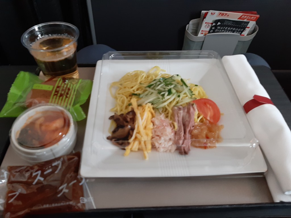 飲み物のリクエストを聞きにきてくれました。トラさんはメニューを見てシャンパンがあったので、シャンパーニュ・パニエ ブリュット セレクションを頼みました。カウちゃんはアップルジュースを頼みました。海老のチリソースと冷し中華の昼食も提供されました。シャンパンはシャンパングラスではなく、プラスチックコップに入っていました。