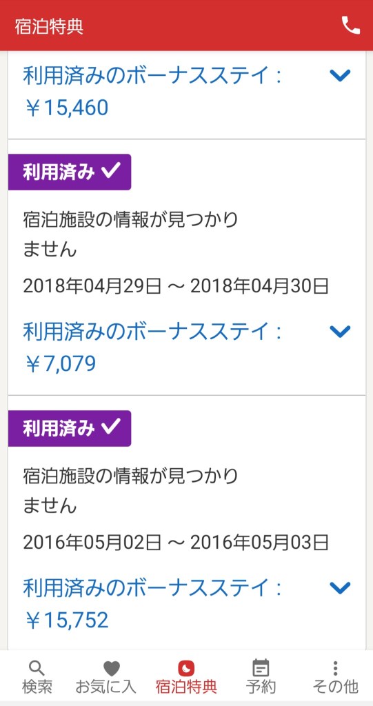 そのため、宿泊スタンプが10個貯まって無料宿泊特典もGETしていました。無料宿泊特典は、これまでの10回分の平均宿泊費用分となります。トラさんの場合は、平均宿泊費用が15,460円でした。前回の2018年は7,079円分、前々回の2016年は15,752円でした。