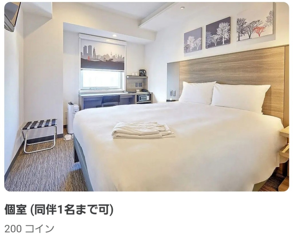 1ヶ月の間に3泊までできますが、2泊分をコインに交換すると50コイン×2となり、合計1,000コインとなり高級ホテルにも泊まれます。