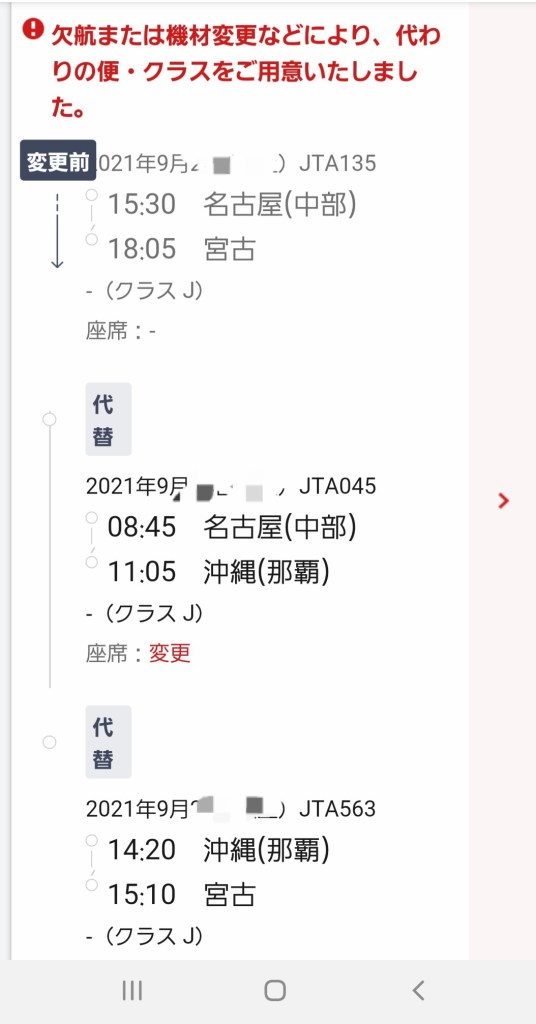 予約していたJAL便が欠航になり、別の便への代替案内がきました。