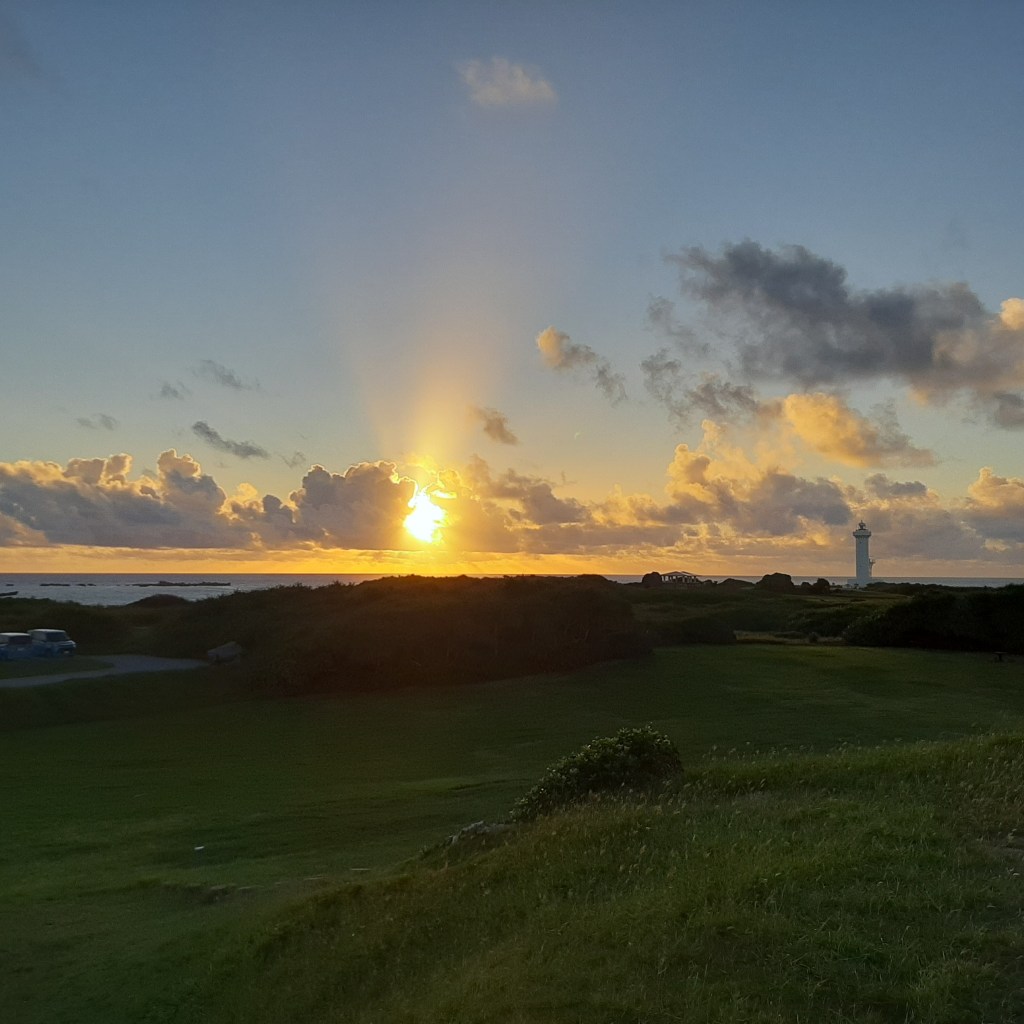 行ってみると灯台のかなり手前に広い駐車場があり、何台か車が停まっています。日の出時刻にはなっていましたが、ちょうど雲がかかっており、太陽は見えませんでした。しかし、周りの雲はオレンジ色に輝いており、ヘイロー(後光)も見えたので、ストレートに太陽を見るよりも神々しく感じられました。