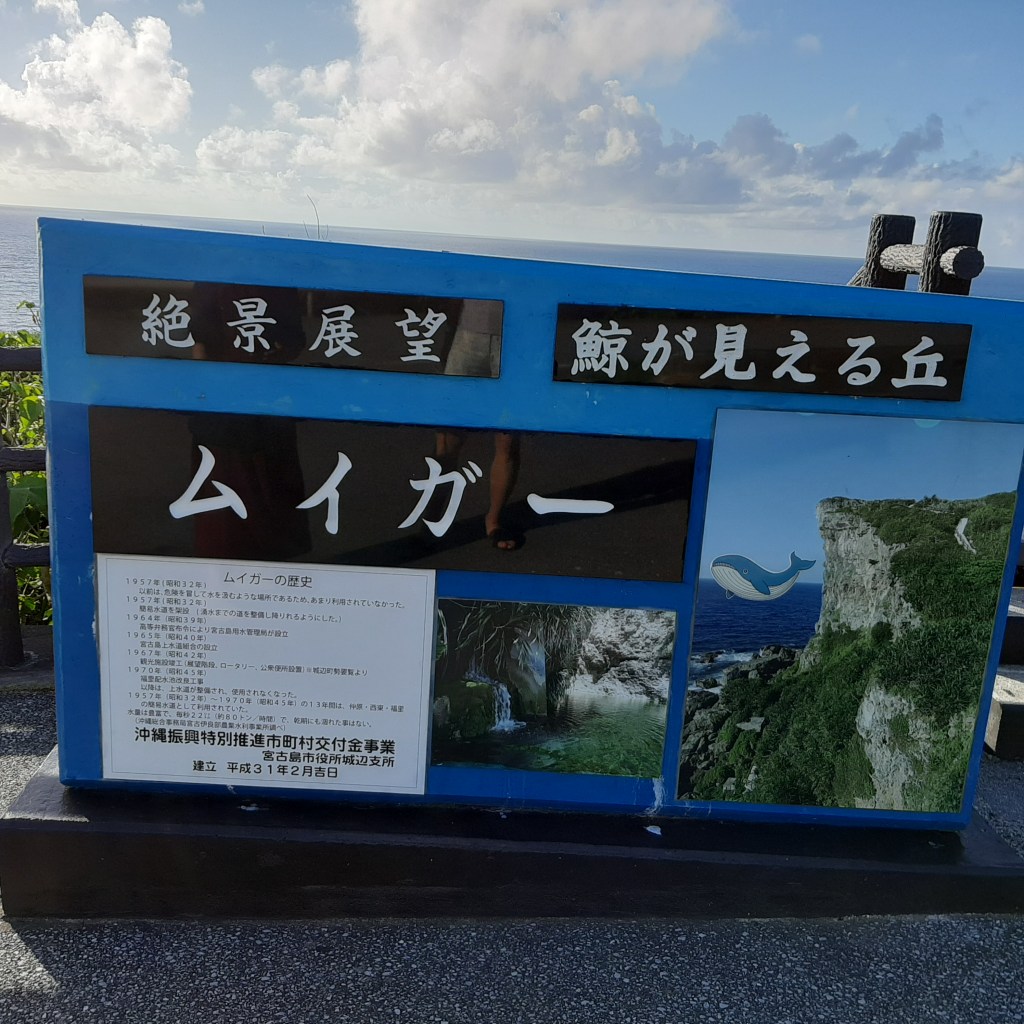 東平安名崎からの帰りに海沿いの道を走っていると、「鯨が見える丘ムイガー」という看板を見つけました。野生の鯨が陸上から見えるなんて素敵ですね。トラさんは飛行機から見えないかと探していますが、目の錯覚でイルカの大群に見えることはよくあります。