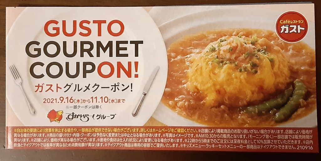 昨日はガストのプラチナパスポートの紹介をしました。会計後にガストグルメクーポンが置かれていたので、もらってきました。