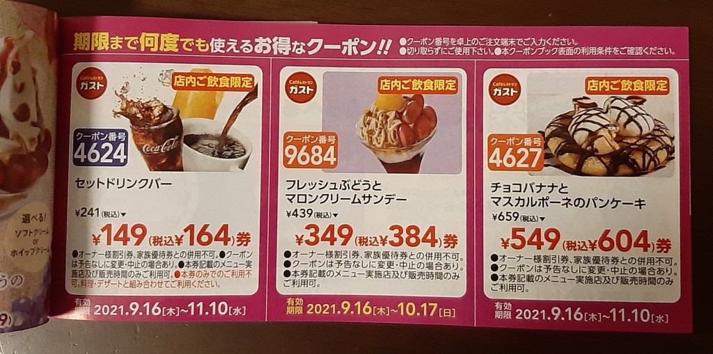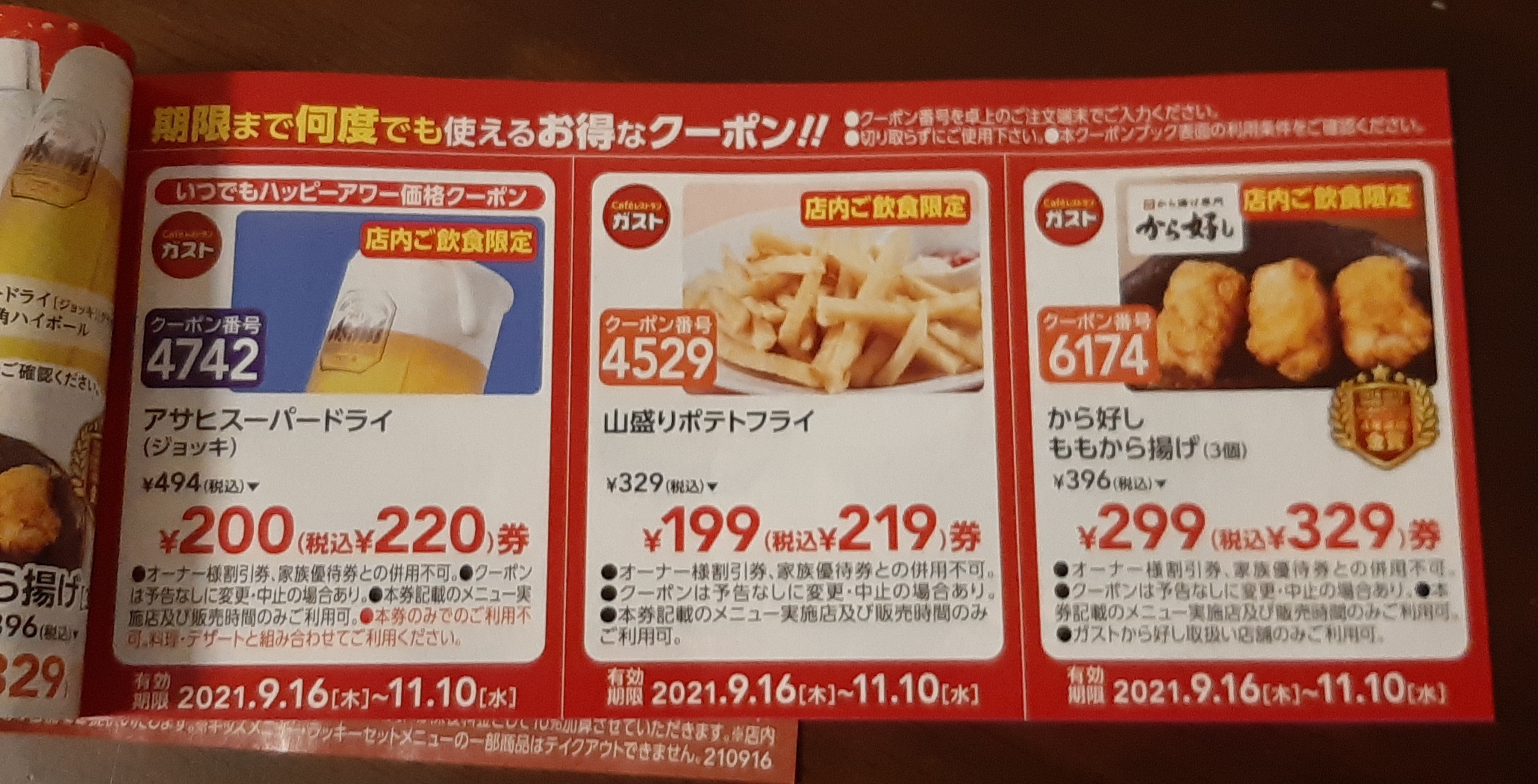 11月10日までの期間限定ですが、ガストグルメクーポンがお得!ですね。