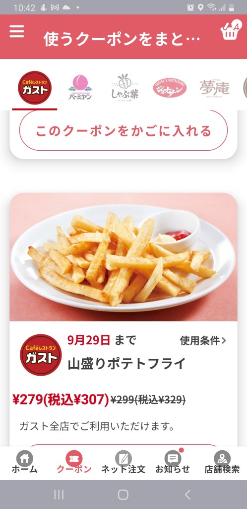 また、「山盛りポテトフライ」は定価329円に対し、アプリクーポンでは307円、ガストグルメクーポンでは219円です。100円以上差があります。