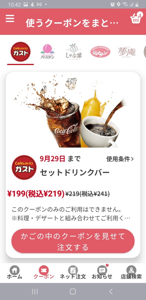 「セットドリンクバー」は定価241円に対しアプリクーポンでは220円、ガストグルメクーポンでは164円です。