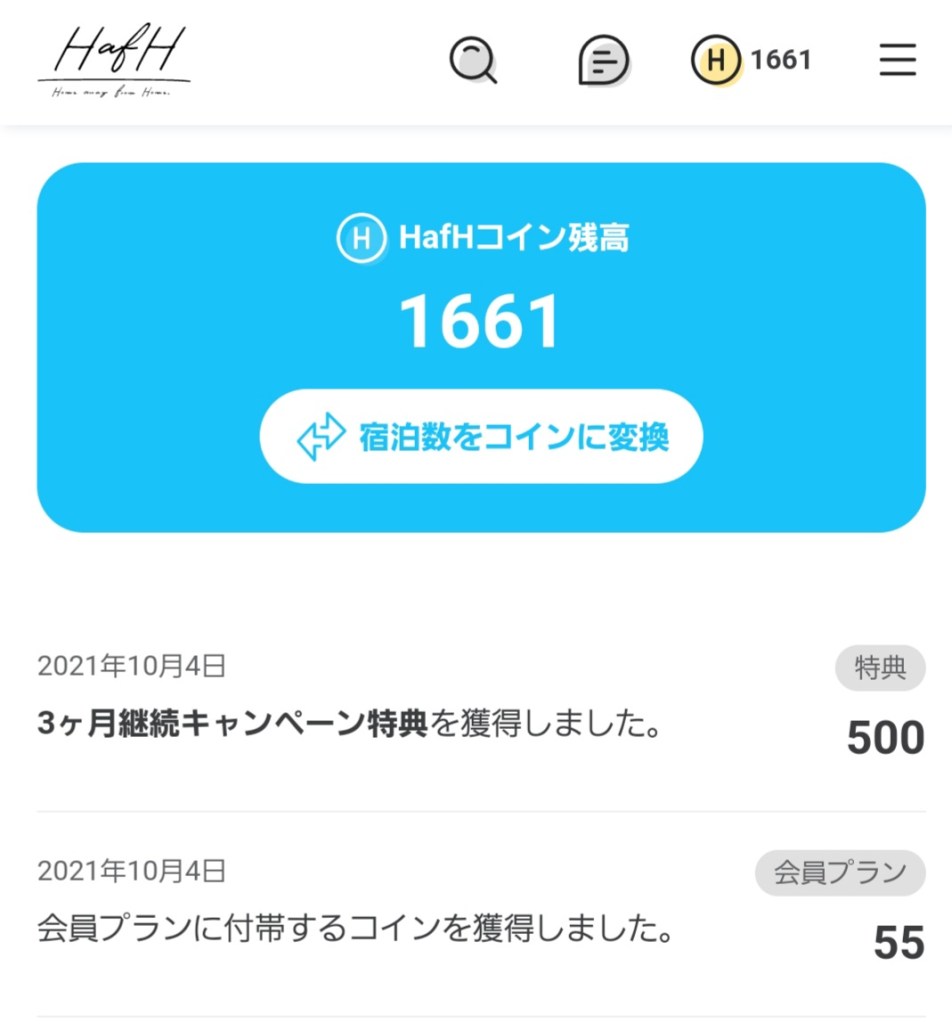 最近、HafHコインが妙に増えたな、と思っていたら、3ヶ月継続キャンペーンで500コインも付与されていました。