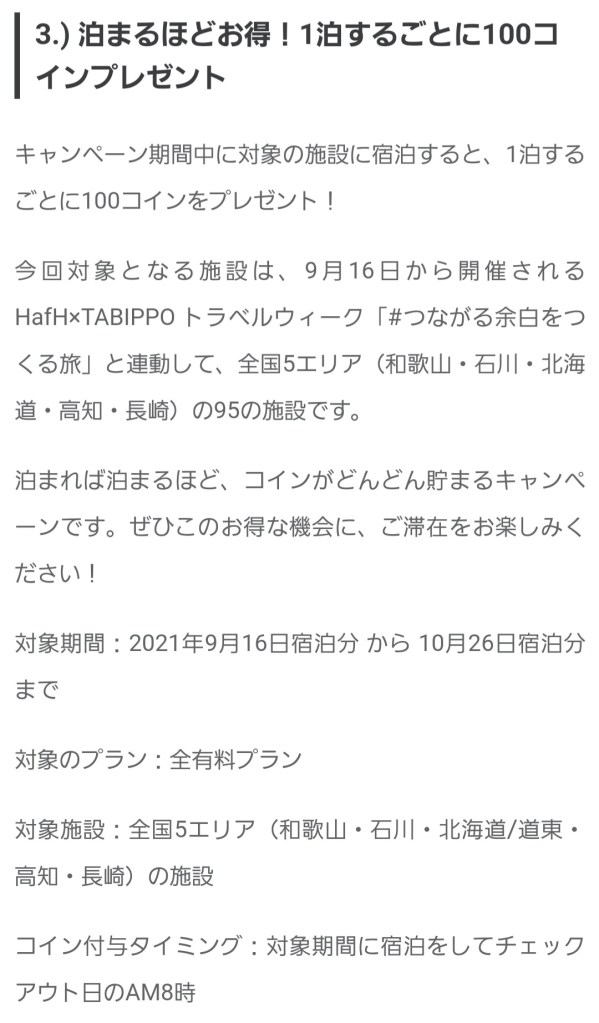 9月16日~10月26日まで、特定のエリア対象に、1泊につき100コインバックというキャンペーンをやっています。