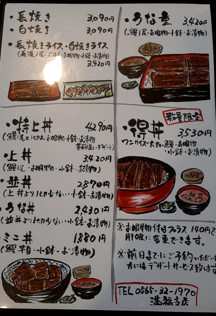 メニューを見ると、数量限定商品が載っていました。3,530円の得丼、ちょっと値段は張りますが、ワンサイズ大きい鰻とあるのでトラさんは思いきってそれにします。カウちゃんはミニ丼(1,880円)にします。お吸い物は付いていないので、付ける場合はメニューから選んで下さいと言われましたが、要りませんと答えました。