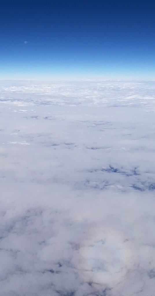 フライトは順調です。途中でブロッキング現象が見えました。青い空と透明に近い月のコントラストが幻想的です。