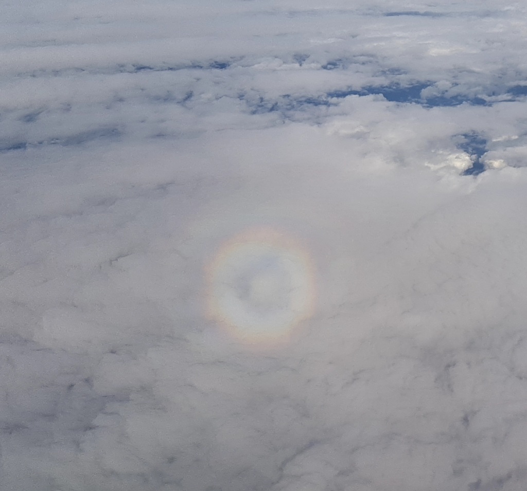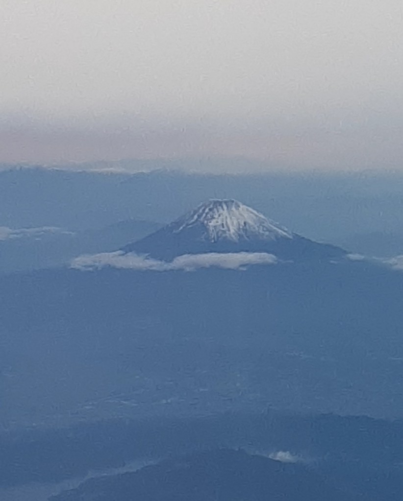 富士山は最初、雲に隠れて見えませんでしたが、高度が上がると見えてきました。スマホのシャッターボタンを押した後に飛行機は雲の中に入ってしまいました。