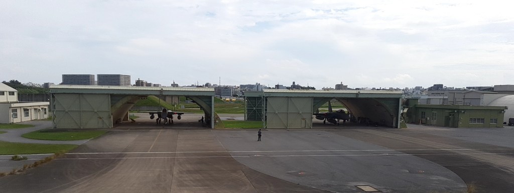 那覇空港を出発する時、自衛隊の戦闘機が格納庫の中で出発を待っている感じでした。