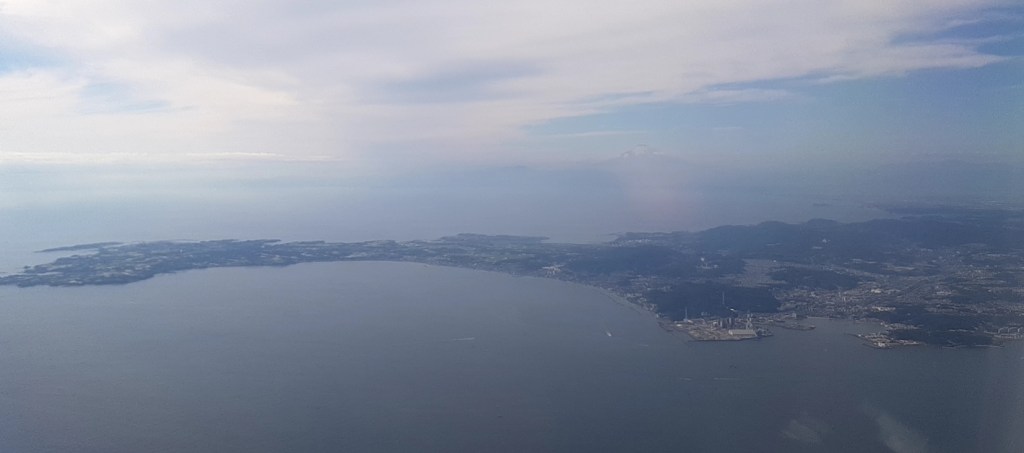 進行方向左側で羽田に向かうと富士山が見えるはずですが、雲がかかっていてうっすらとしか見えません。