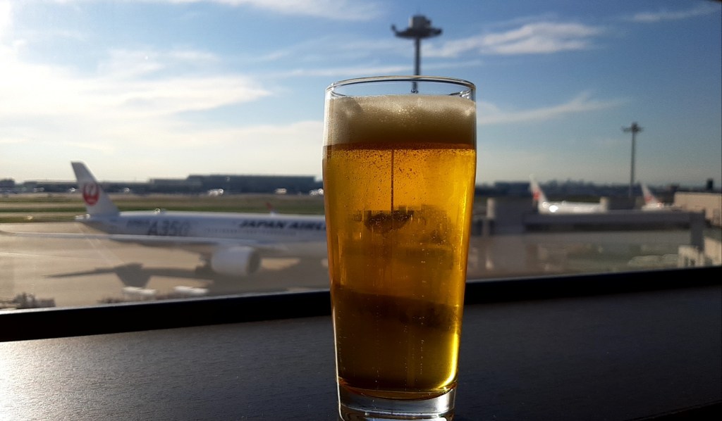 ラウンジでは生ビールを飲みました。昨日と一緒のサントリープレミアムモルツにしました。恐らく、これから搭乗するであろうA350-900をバックにパチリ。