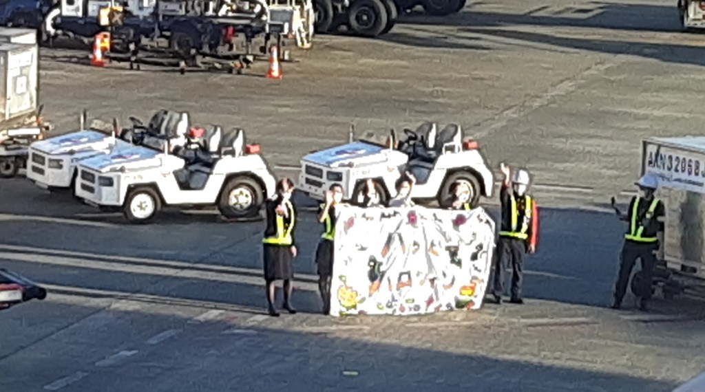 窓の外ではJALのスタッフがハロウィンのお手製のような横断幕をかざしながら手を振っています。トラさんも思わず手を振ってしまいました。