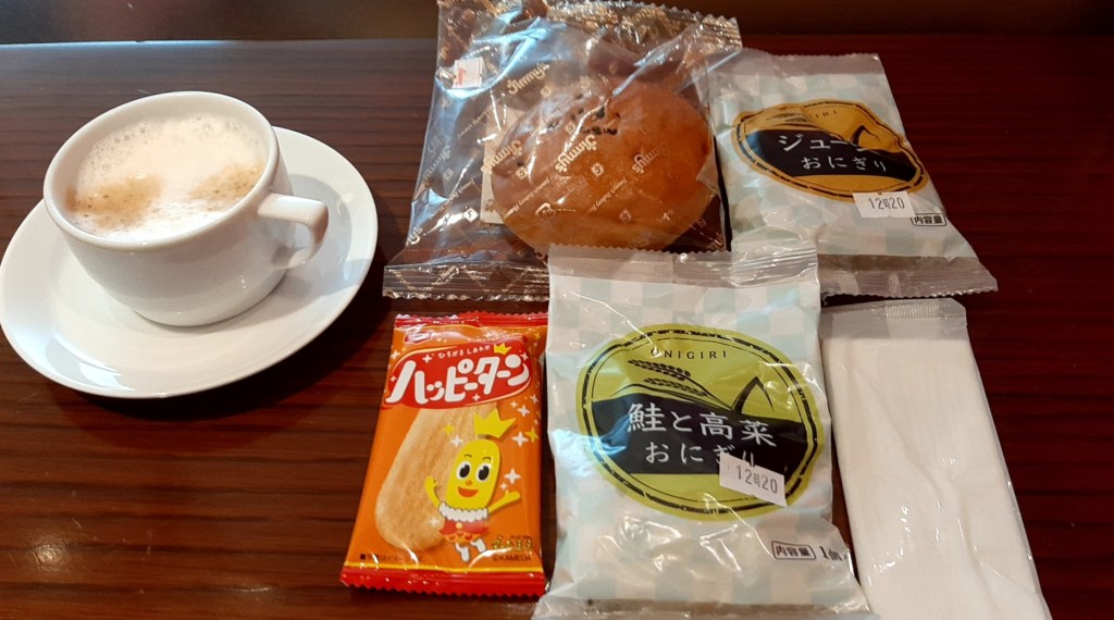 お腹がすいていたのでパンやおにぎりも頂きました。アルコール類は朝11時以降なので飲めません。トラさんはカプチーノにしました。