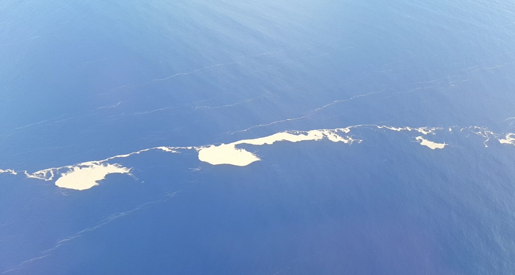 離陸時、イヤープレーンは確かに効いている気がしました。沖縄の近くの海には最近ニュースになっている海底火山の爆発による漂流物があるようでした。