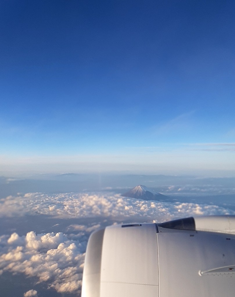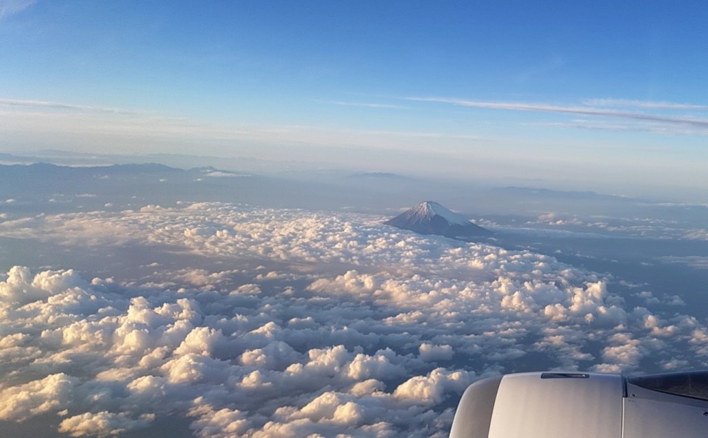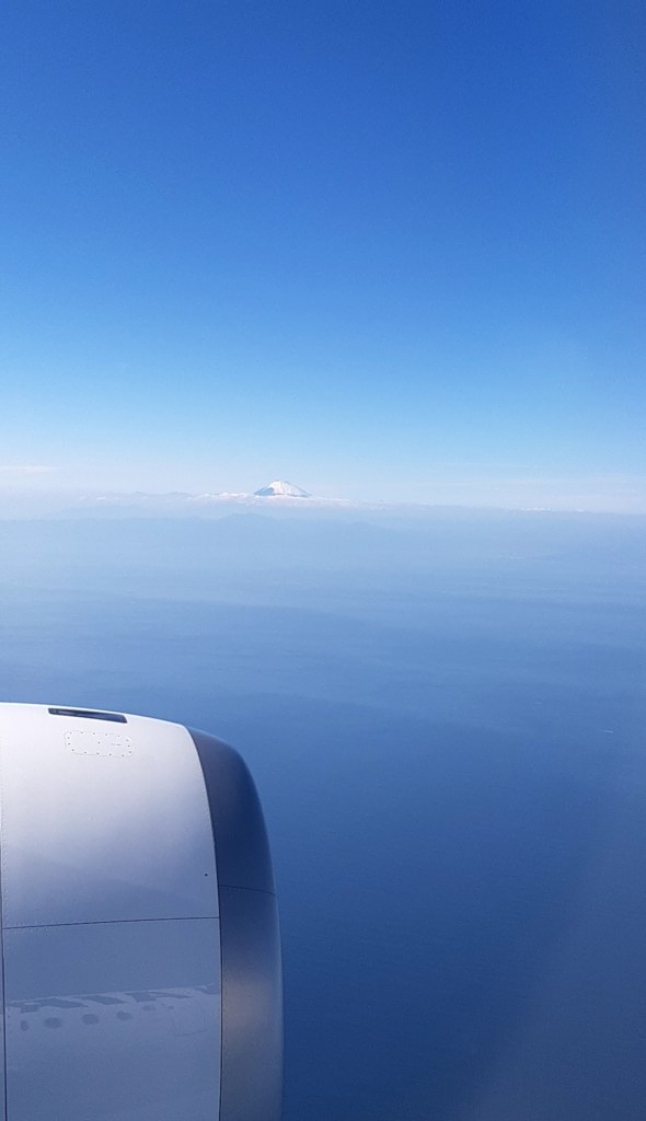 そろそろ着陸に向けて降下する頃、機内アナウンスで左側に富士山が見えるとの機長からのメッセージがありました。