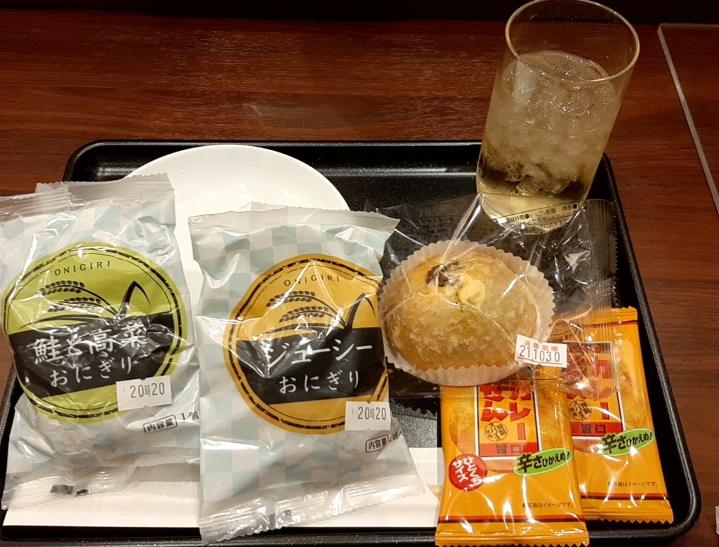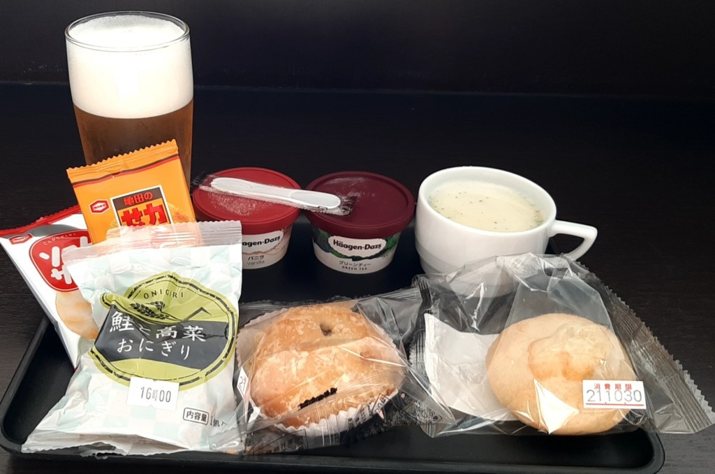 トラさんはエビスビール、スープ、鮭と高菜おにぎり、カレーパン、ポロネーゼロール、亀田製菓のおせんべい、ハーゲンダッツアイスクリーム2種類を頂きました。