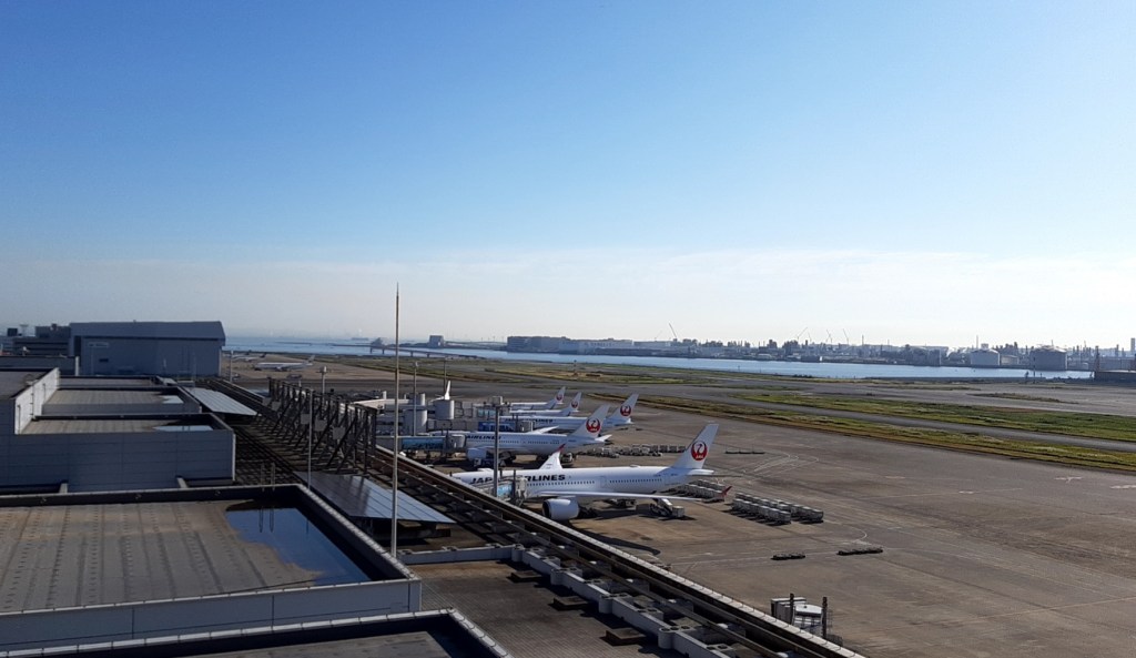 羽田空港に到着し、多少時間があるので6階の展望デッキへ行ってきました。結構人がいます。今日はお天気が良いので屋外に出ると気持ちがいいですね。